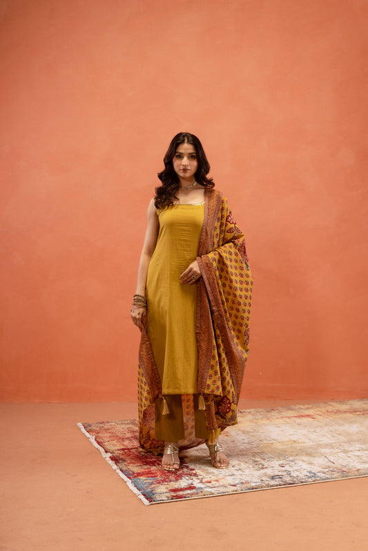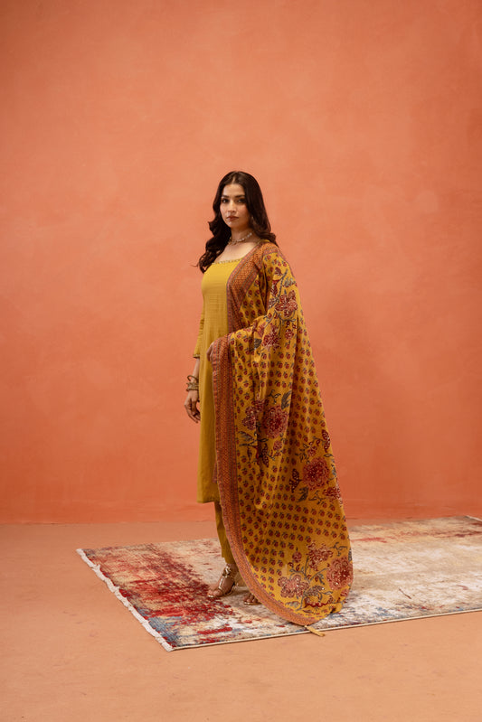 A celebration of the season’s quiet elegance, Autumn Veil brings together four hues that capture the warmth and depth of autumn — dusty pink, teal, marigold yellow, and soft grey. Each piece blooms with delicate floral motifs, reimagined in festive silhouettes that balance tradition with modern grace.