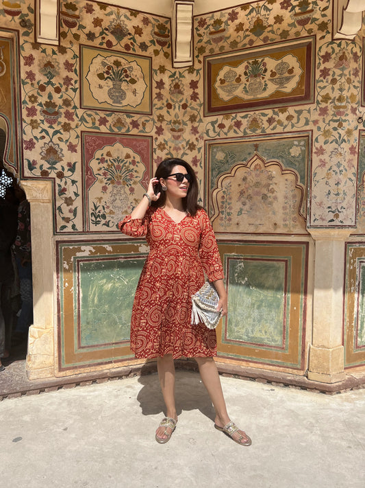 Sleeveless Orange Printed Lurex Cotton Dress