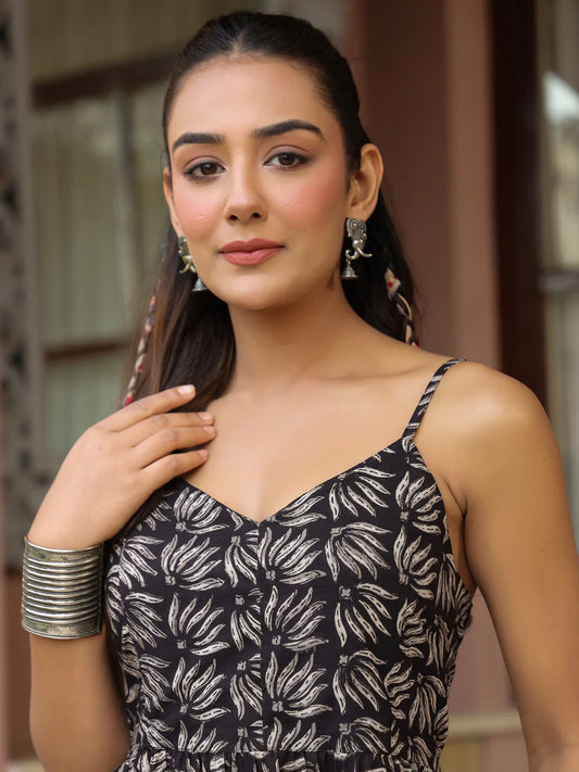 Black Booti Handblock Printed Sleeveless Midi Dress