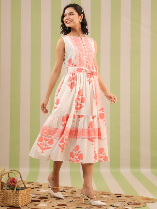 Pastel Pink Handblock Printed Cotton Dress with Belt and Pockets