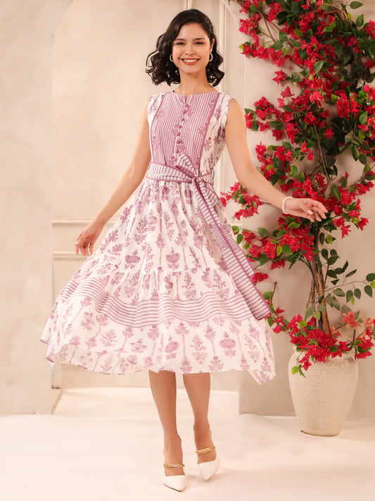 White & Purple Sleeveless Maxi Dress with Belt and Pockets