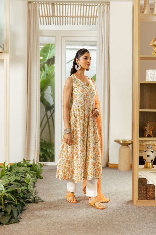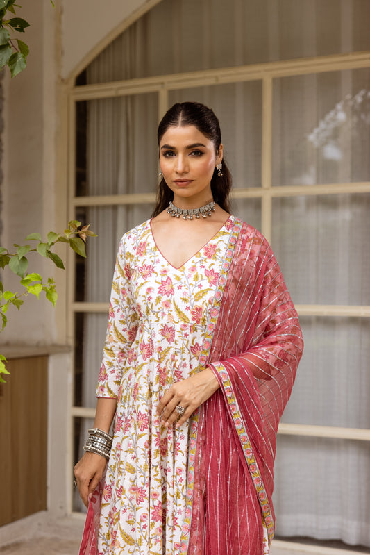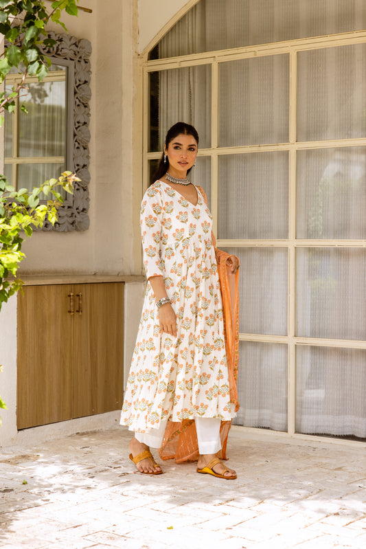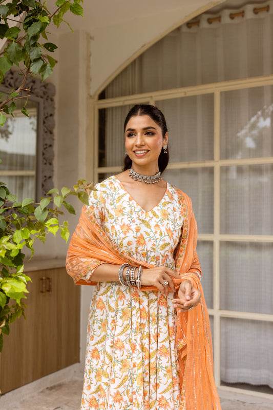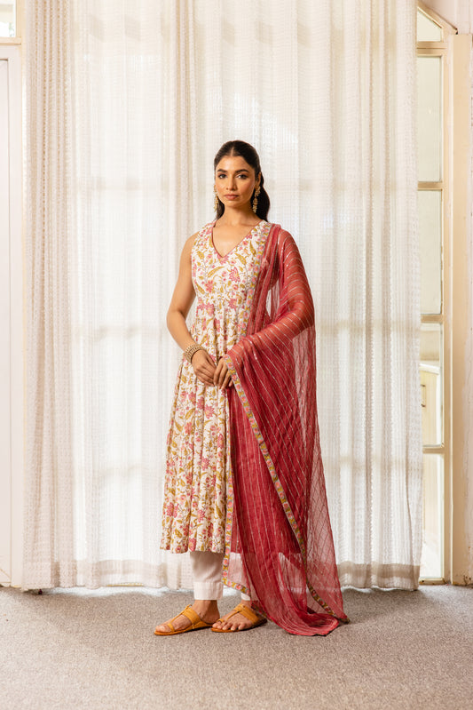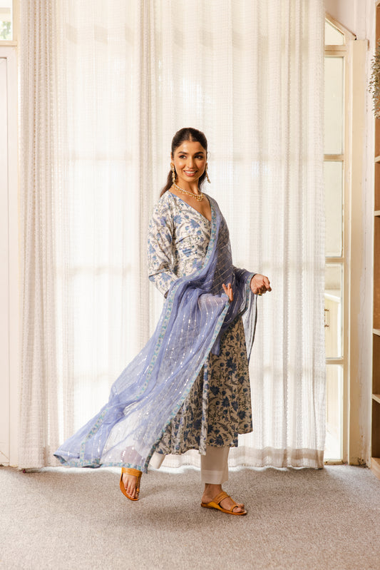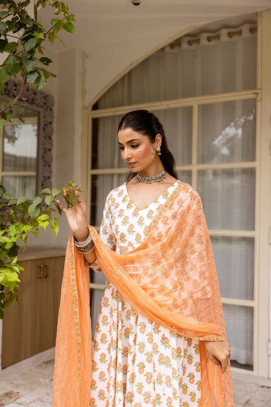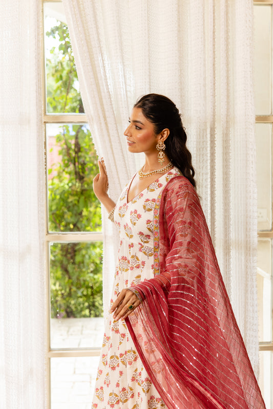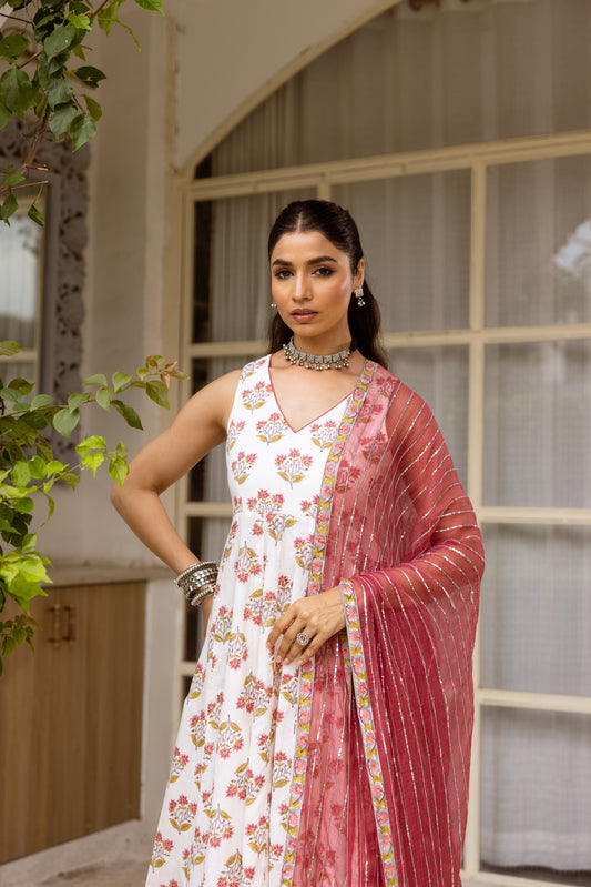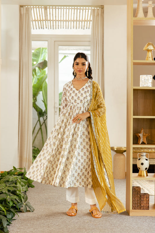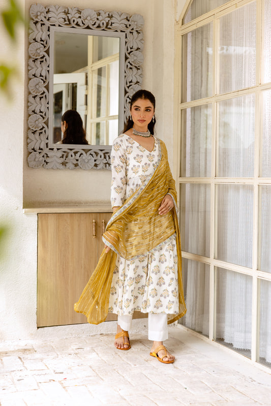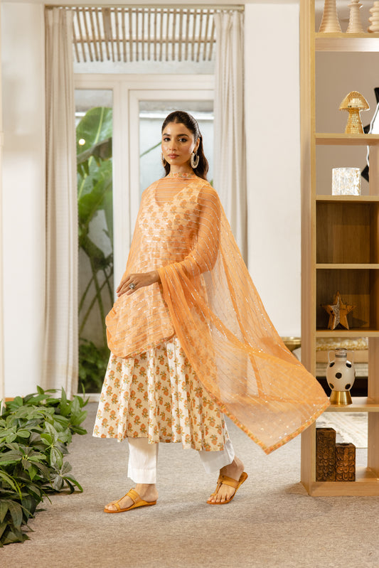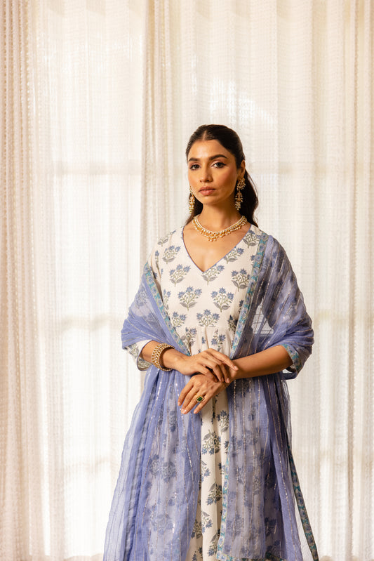 In this edition of Echoes, pure white forms the canvas for the timeless craft of block printing. Each piece is adorned with hand-stamped motifs and framed with printed borders, then paired with shimmer shawls that add a gentle glow. Rooted in tradition yet styled for today, the collection is a tribute to craftsmanship, simplicity, and quiet elegance.