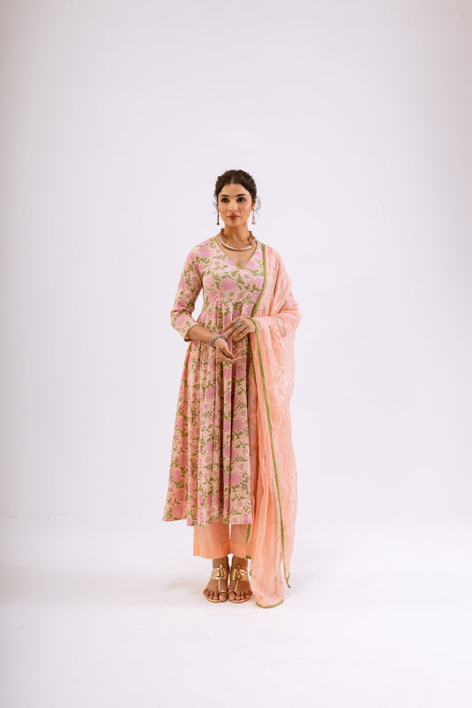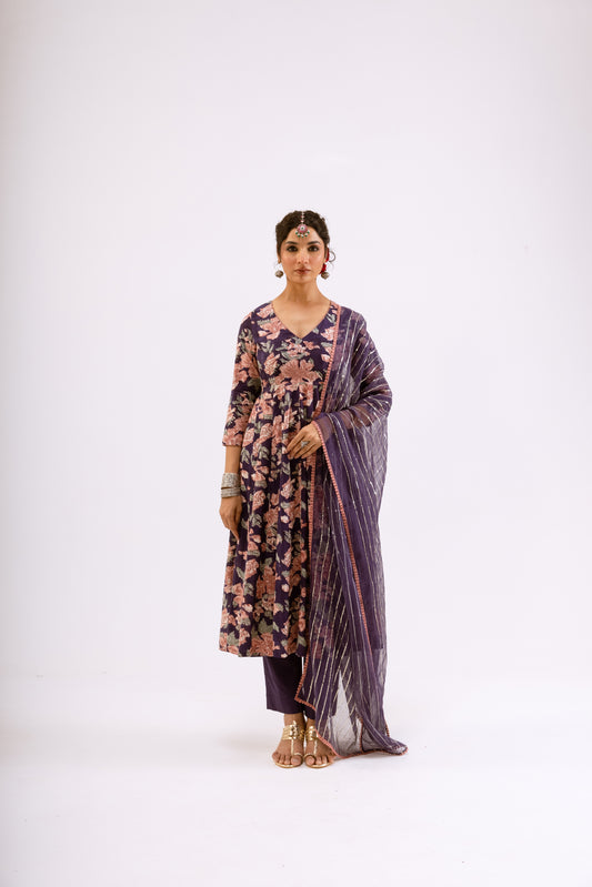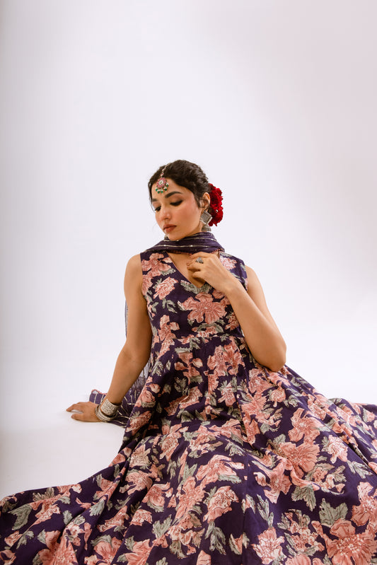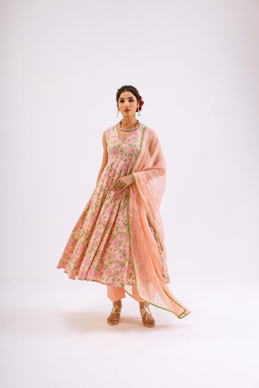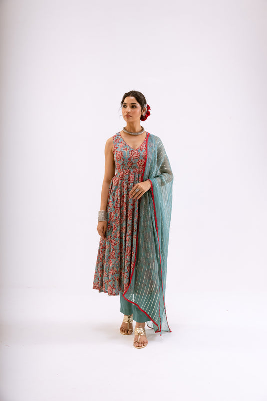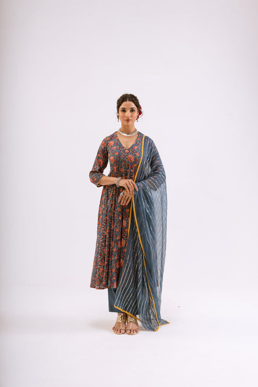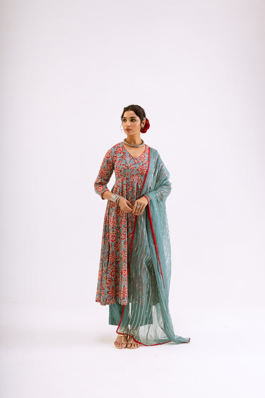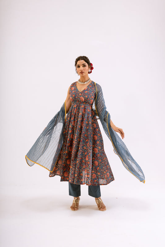 Our iconic Echoes of Block Print returns — this time with a bold new chapter. By your choice, the neckline transforms into a graceful V, and the shawl is reimagined with lined sequins, bringing subtle sparkle to tradition.