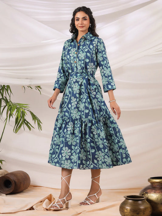 White Printed Cotton Maxi Dress with Three-Quarter Elasticated Sleeves