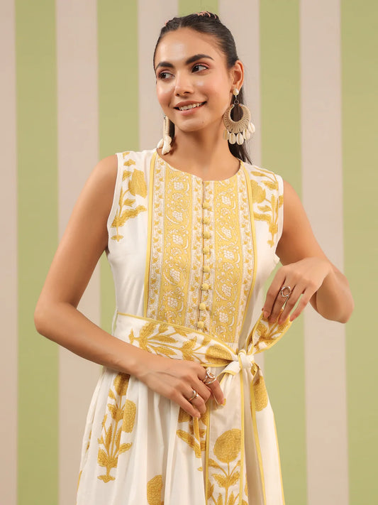 White & Yellow Sleeveless Maxi Dress with Belt and Pockets