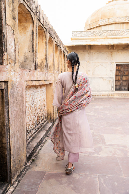 V-NECK PASTEL PURPLE EMBROIDERED CRUSHED TISSUE KURTA SET