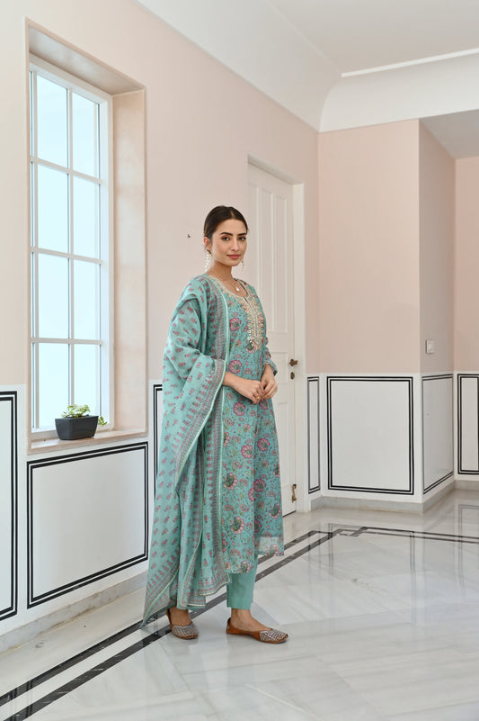 ICE BLUE NECK EMBROIDERED GOTA PATTI CHANDERI KURTA SET