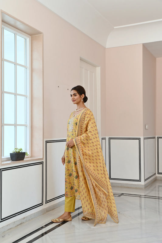 MUSTARD YELLOW NECK EMBROIDERED GOTA PATTI CHANDERI KURTA SET