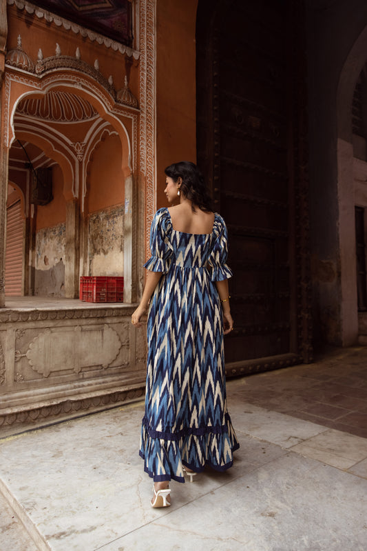 Embroidered Yoke Midi Thin Strap Dress- Blue