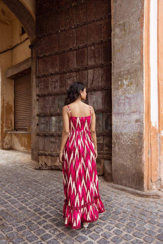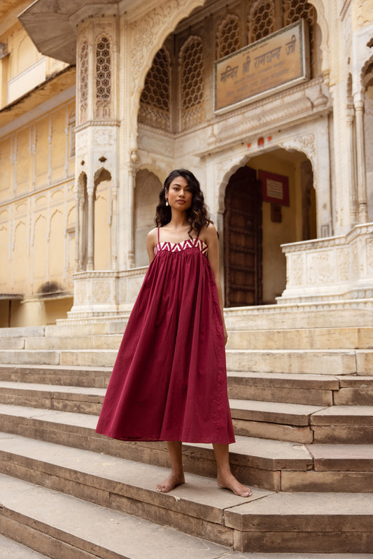 Embroidered Yoke Midi Thin Strap Dress- Pink