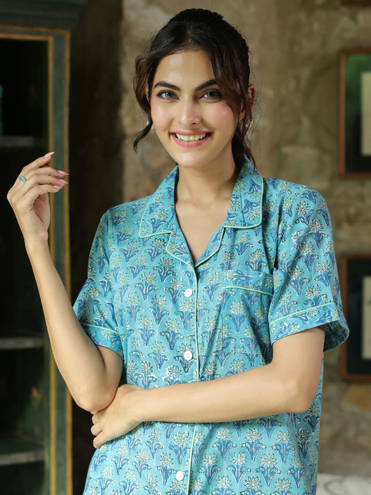 Turquoise Handblock printed PJ Shorts set
