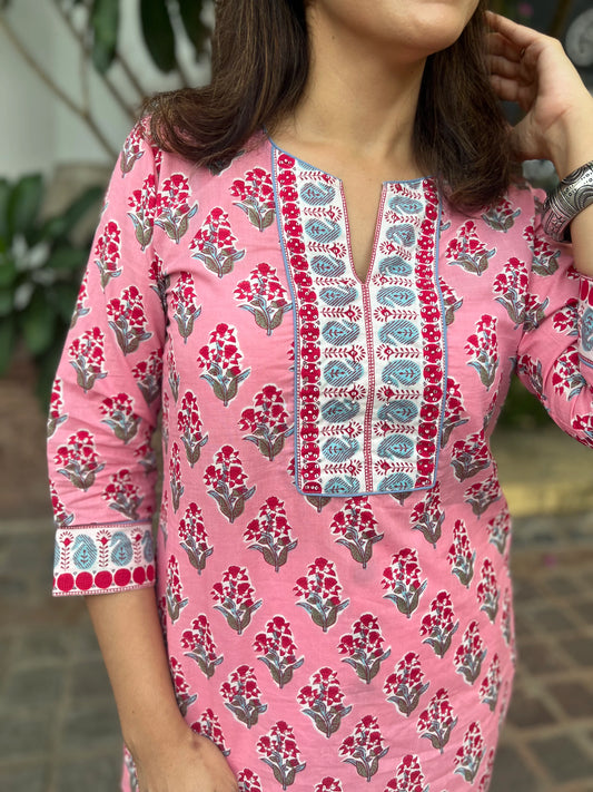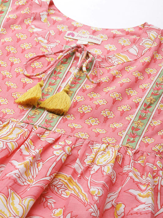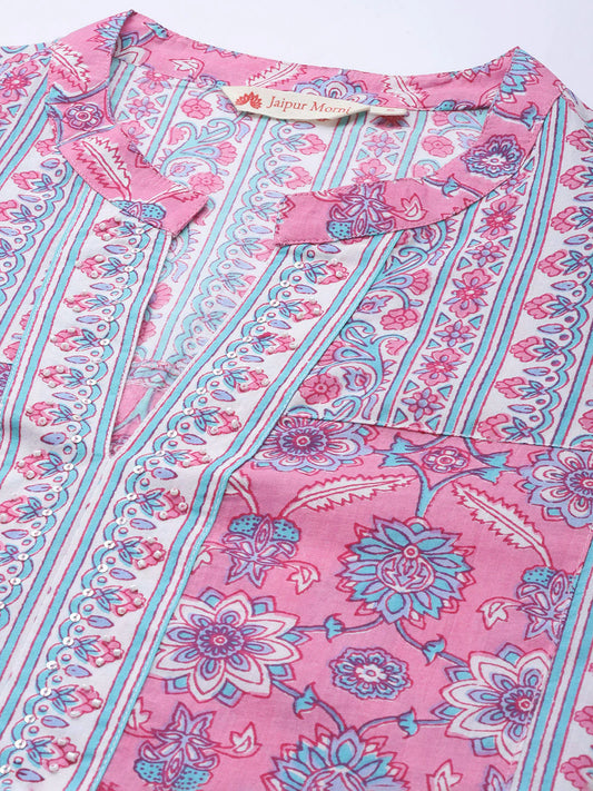 Pink Floral Printed Pure Cotton Sequinned Kurti