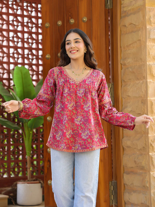 Pink Floral Printed V-Neck Pintuck Cotton Top