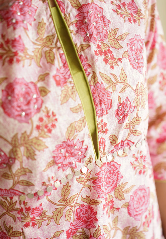 Pink Floral Printed Pure Cotton Sequinned Kurti