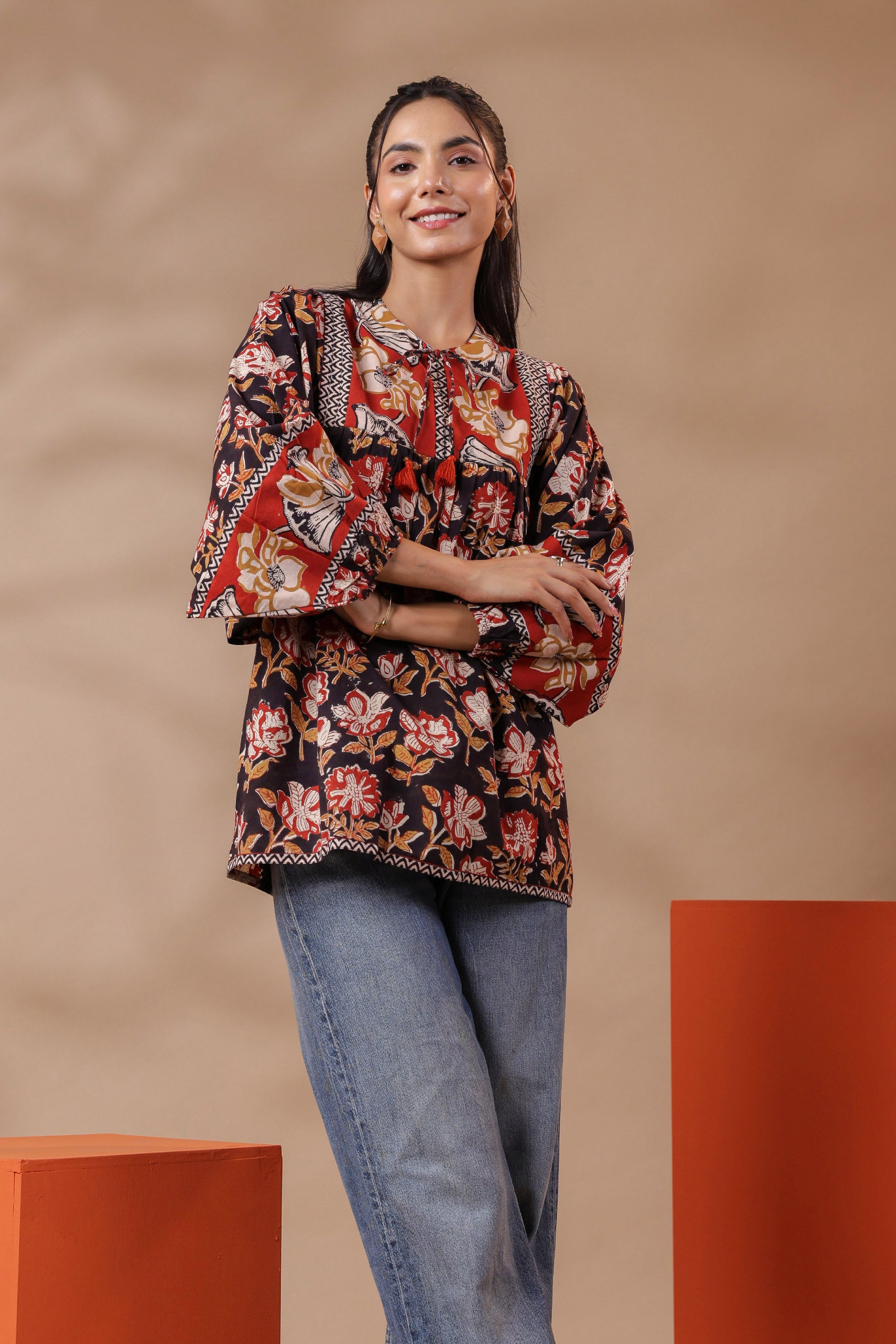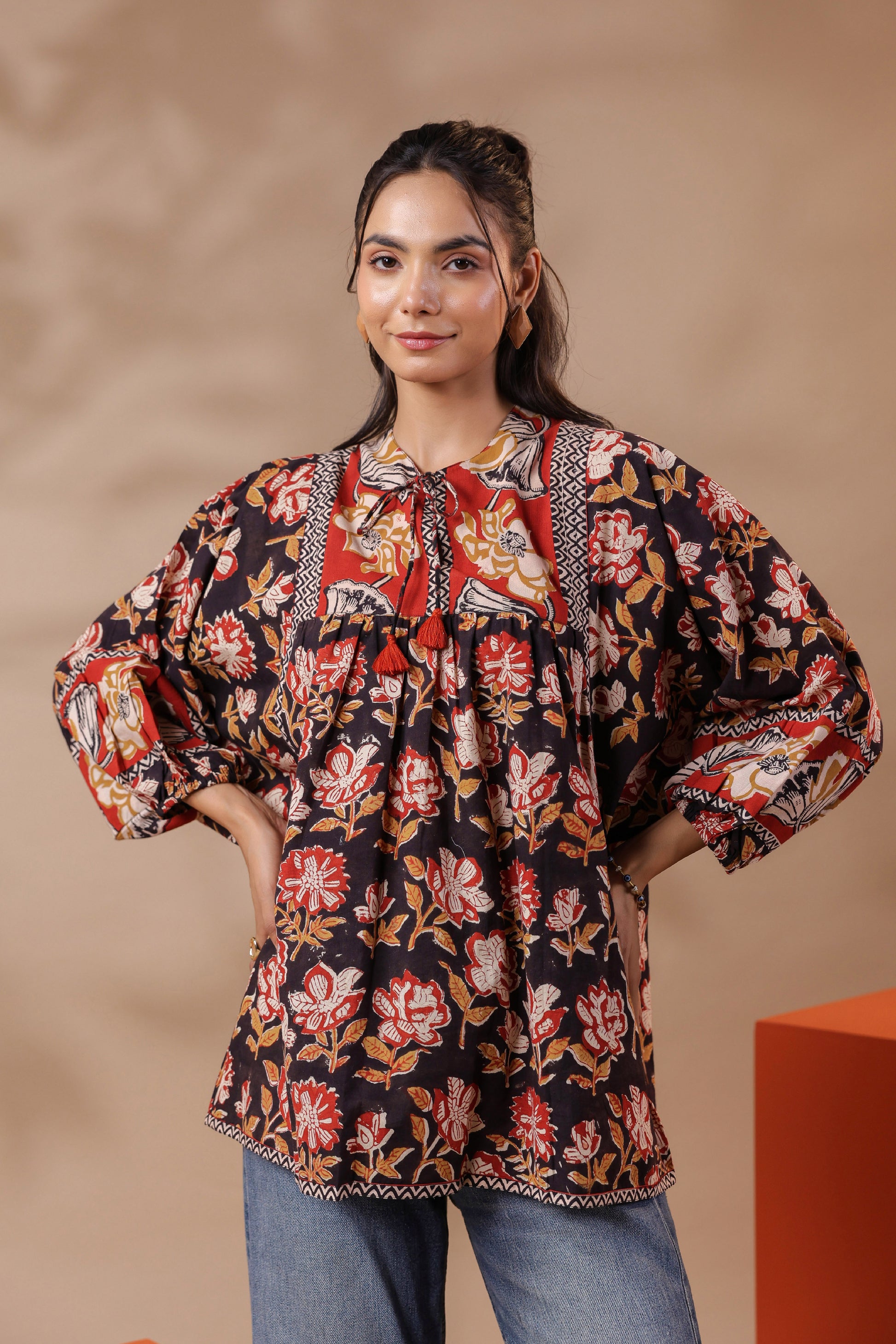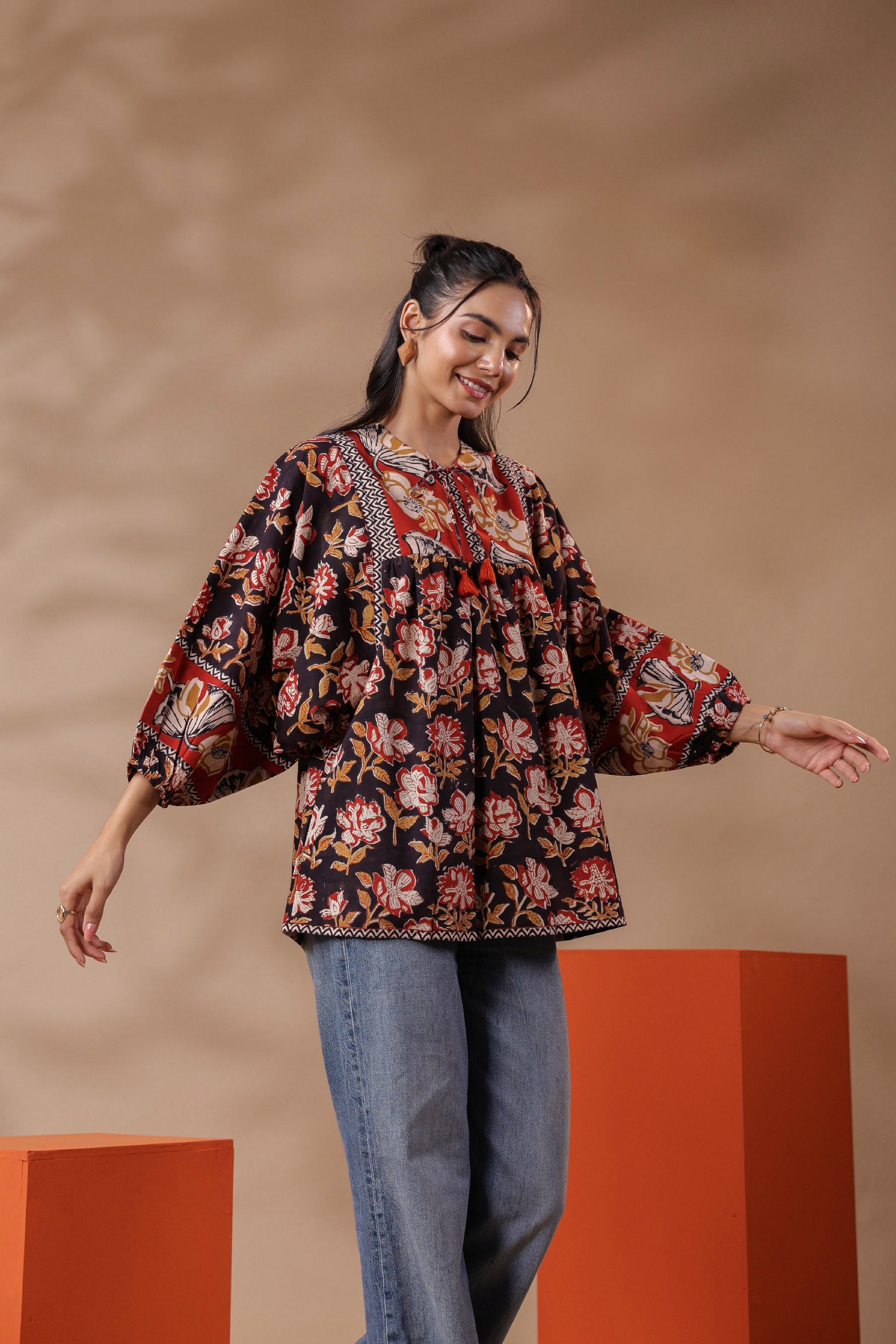 Black Hand-Block Printed Boho Volume Sleeved Top