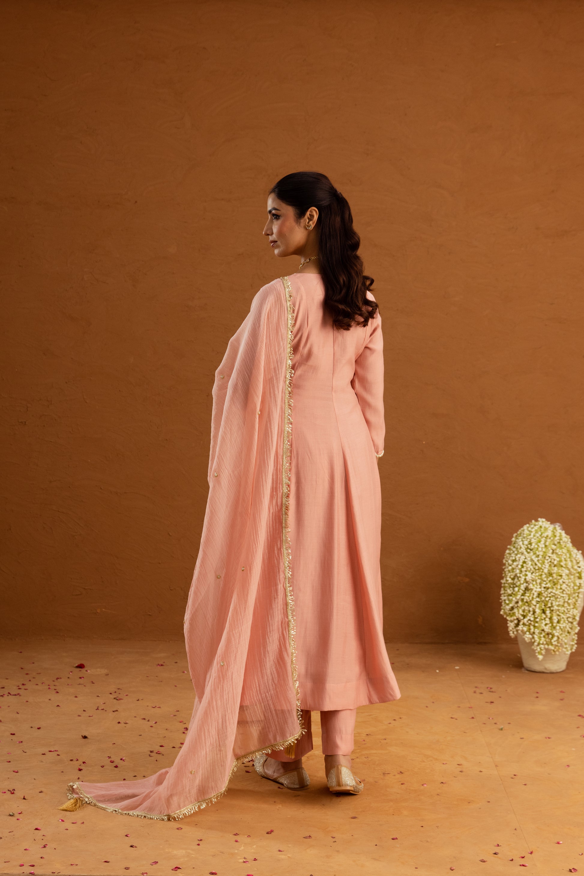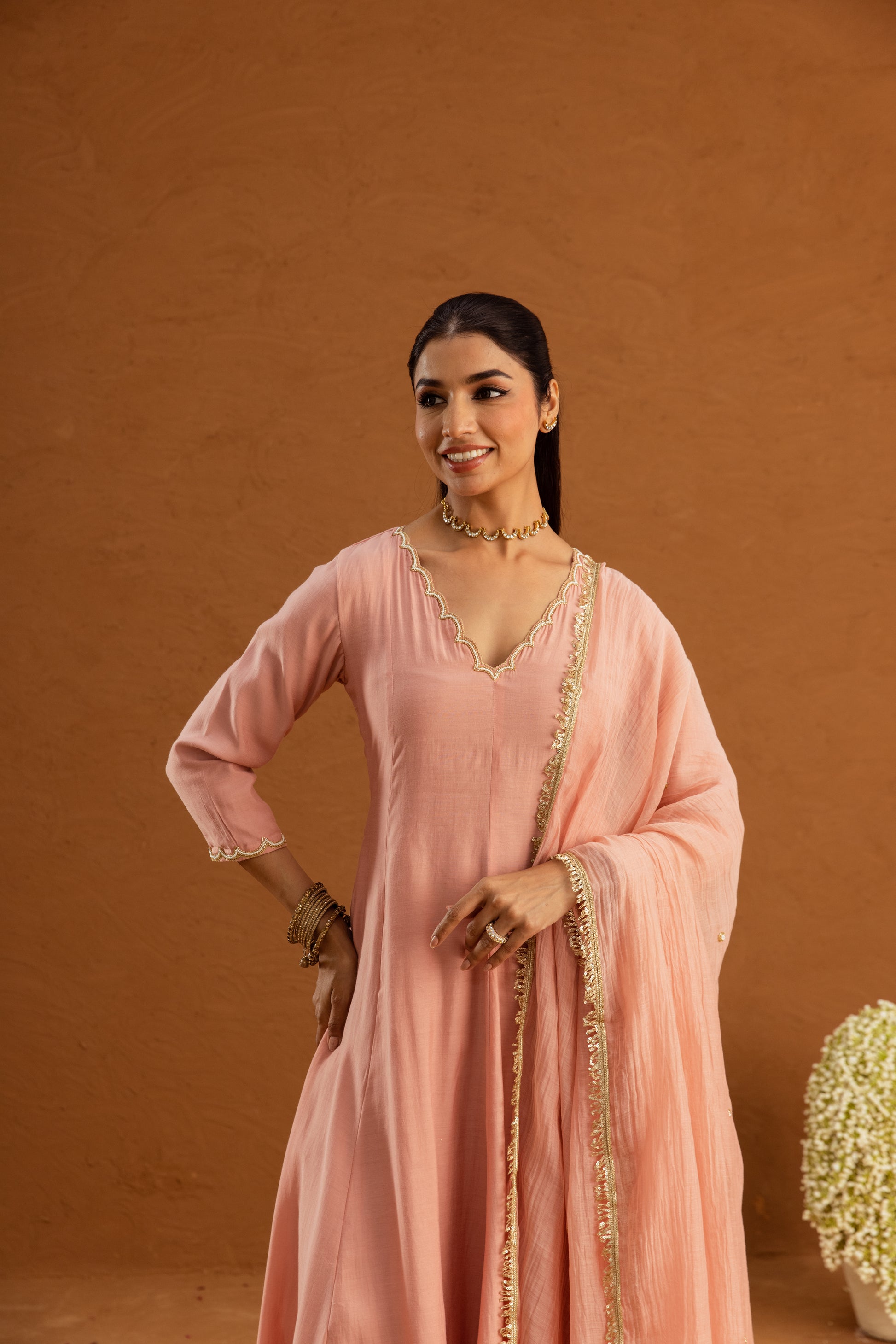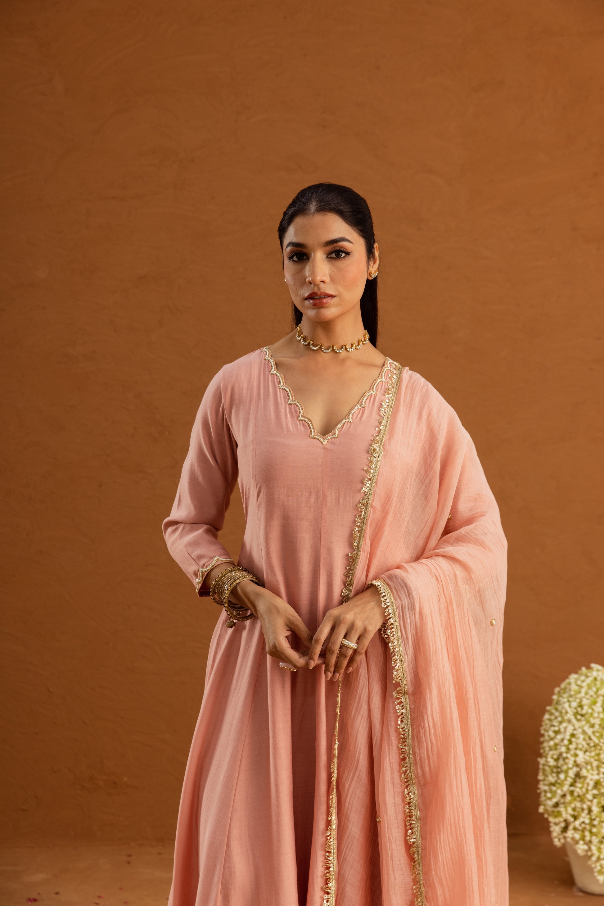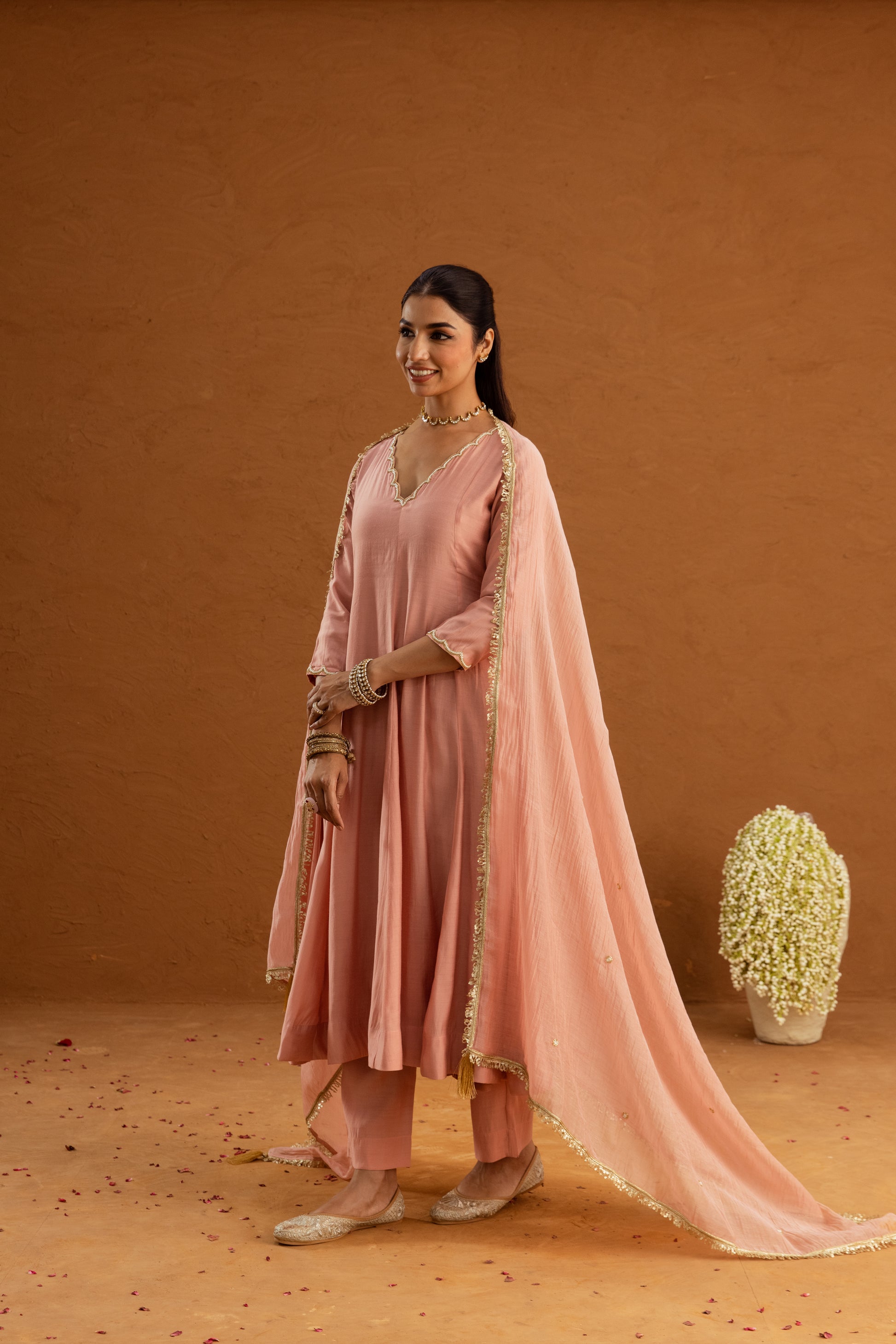 Each suit is crafted from luxurious modal silk, featuring a stunning scalloped beaded neckline that showcases over five hours of meticulous handwork. The shawl, made of exquisite mul chanderi, is elegantly finished with intricate hand detailing, ensuring that every piece is a testament to artisanal craftsmanship. Together, they create an ensemble that radiates sophistication and grace.