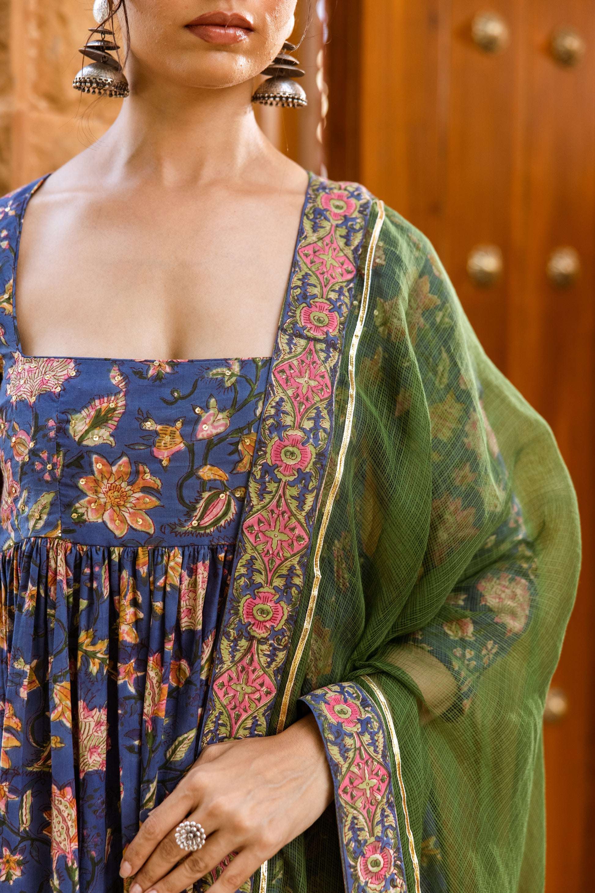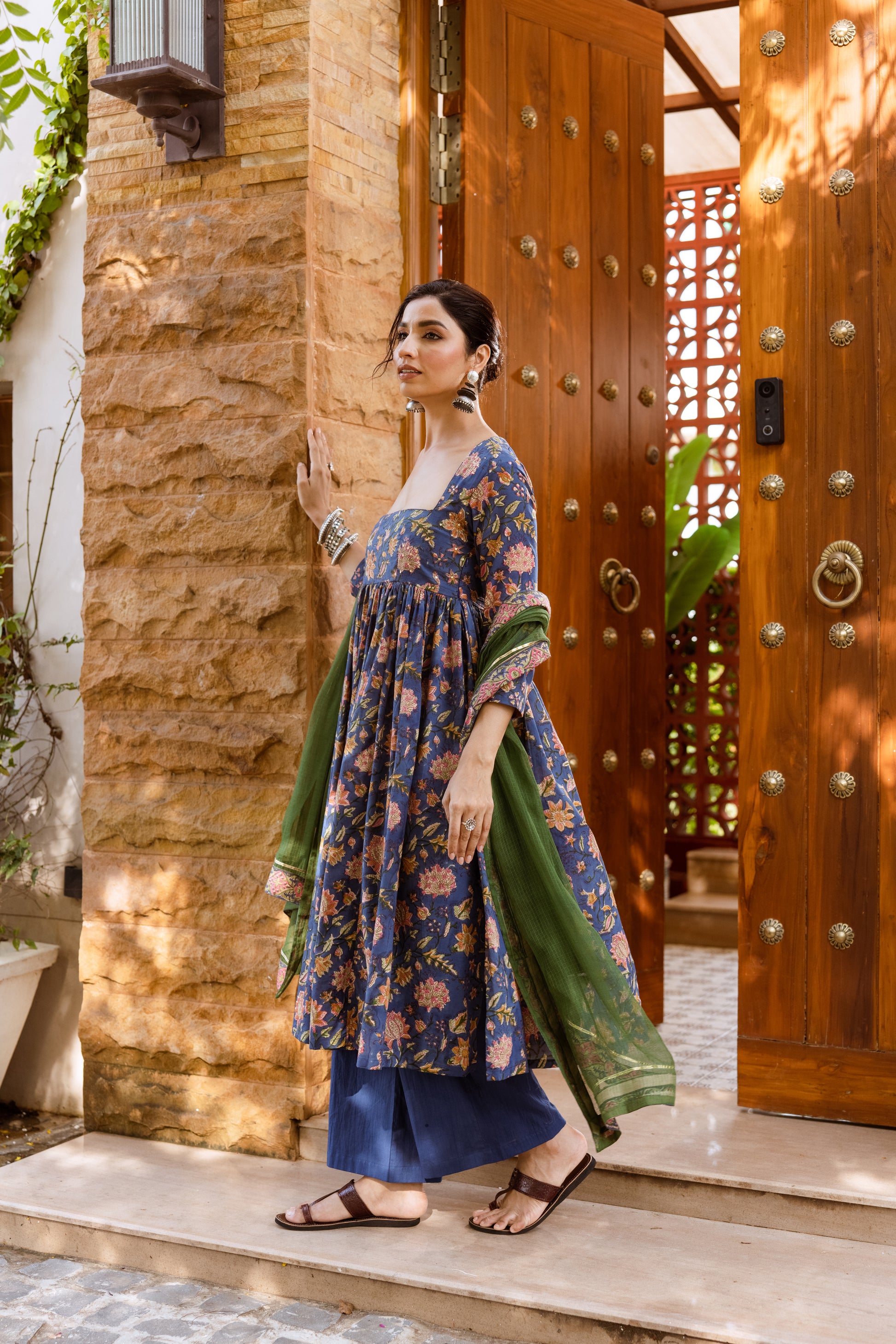 Step into effortless elegance with our 3-piece Nyra cut suit designed for festive charm. Crafted from breathable, high-quality fabric, the suit features traditional handblock prints enhanced with delicate handwork, adding a touch of artisanal sophistication. The ensemble includes a coordinating contrast shawl, completing the look with graceful drape and vibrant flair.