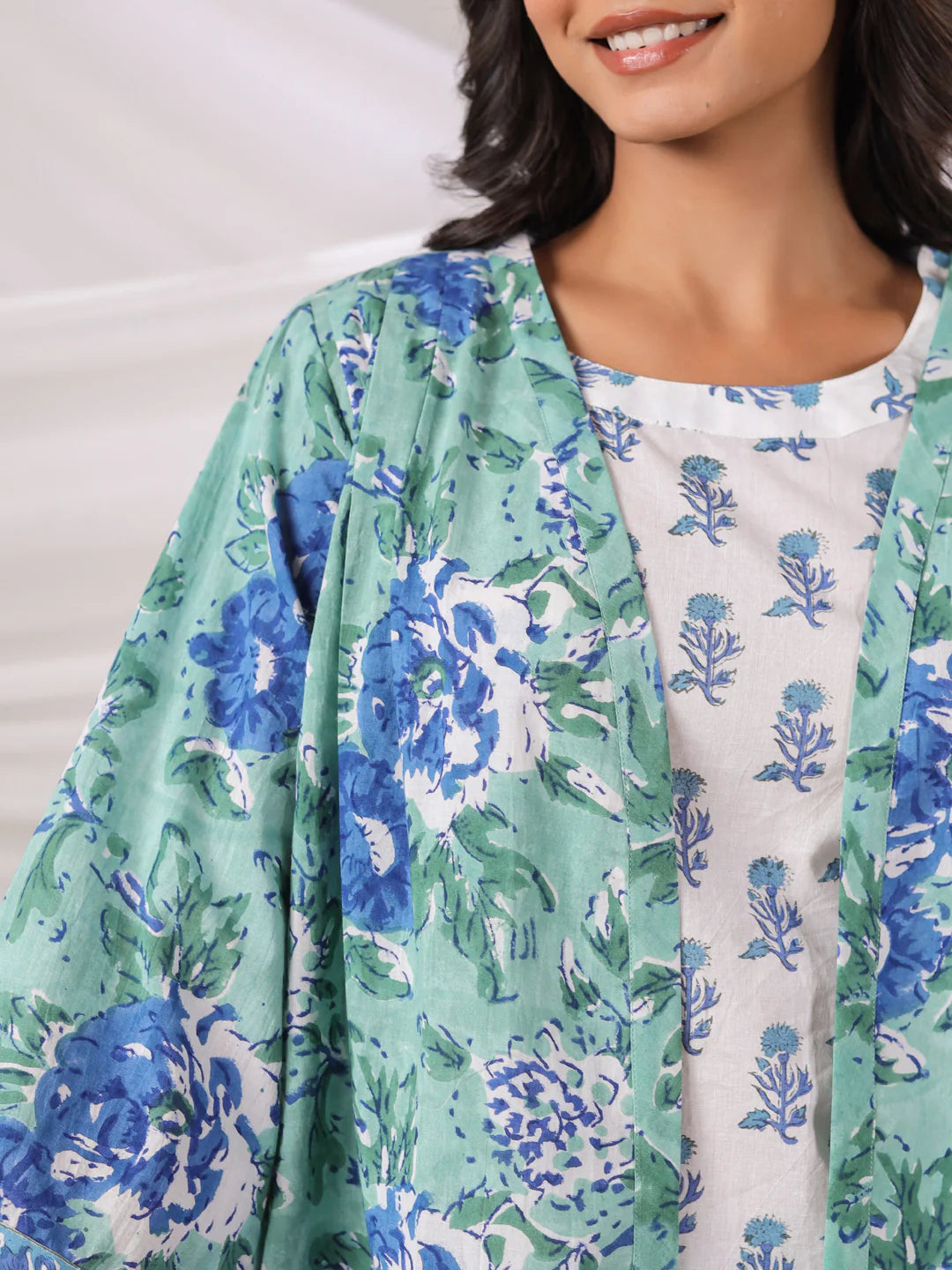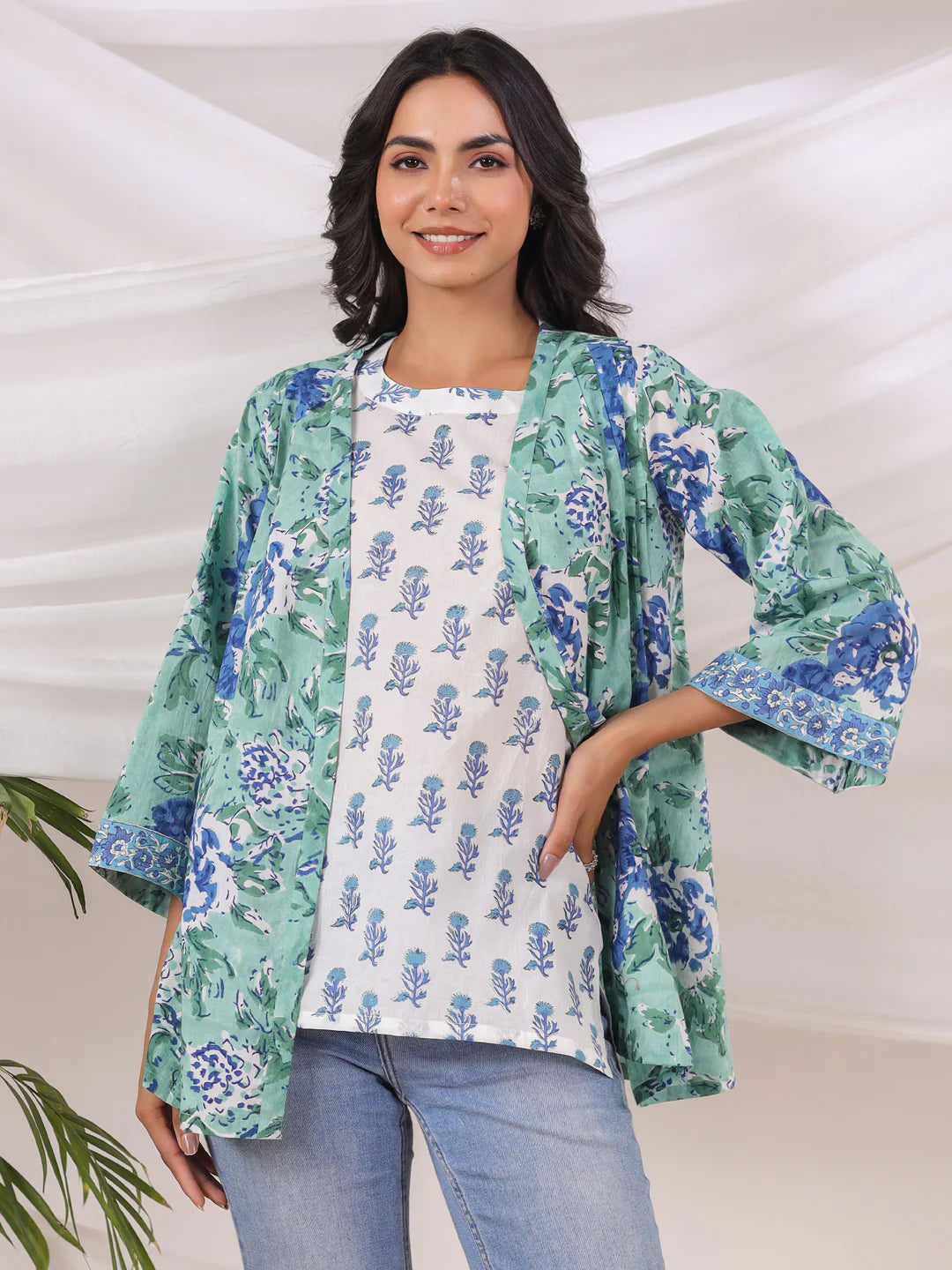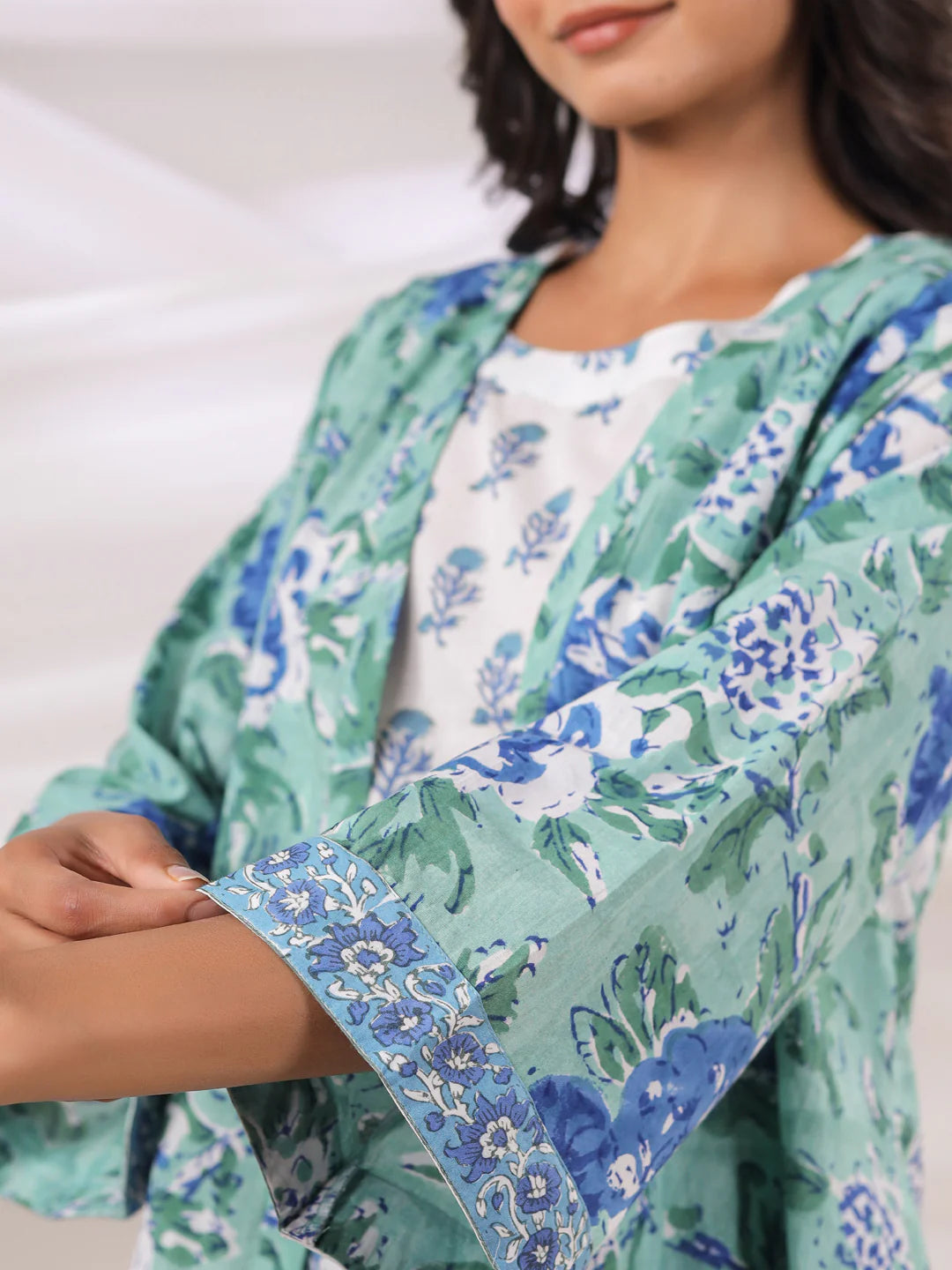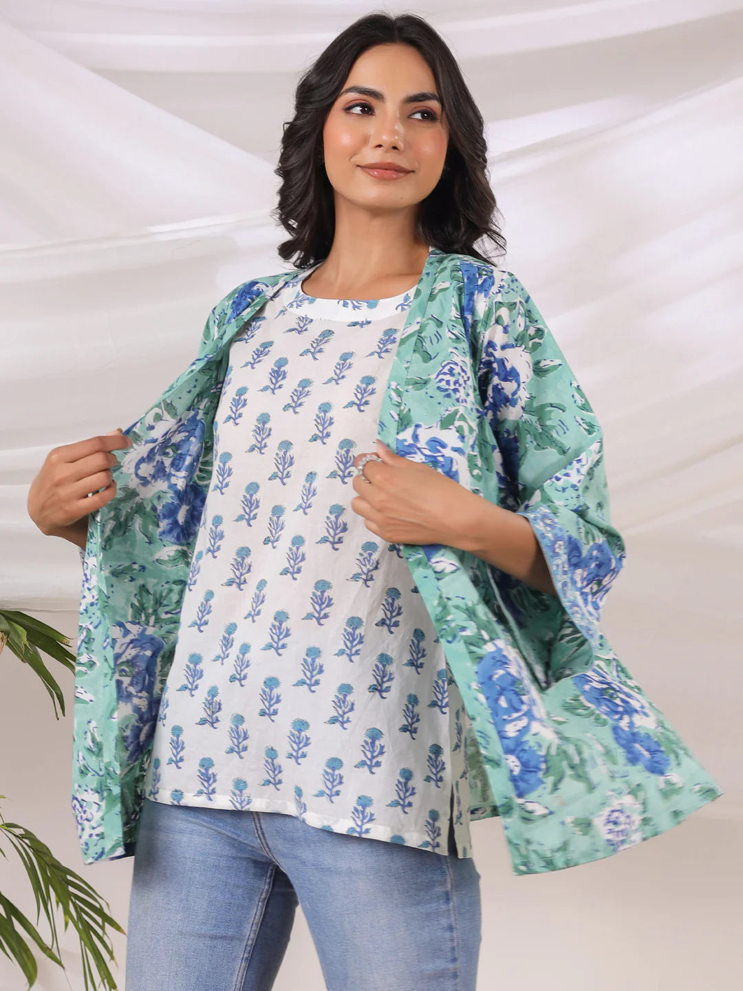 Blue & Green Handblock Printed Cotton Inner & Jacket Set