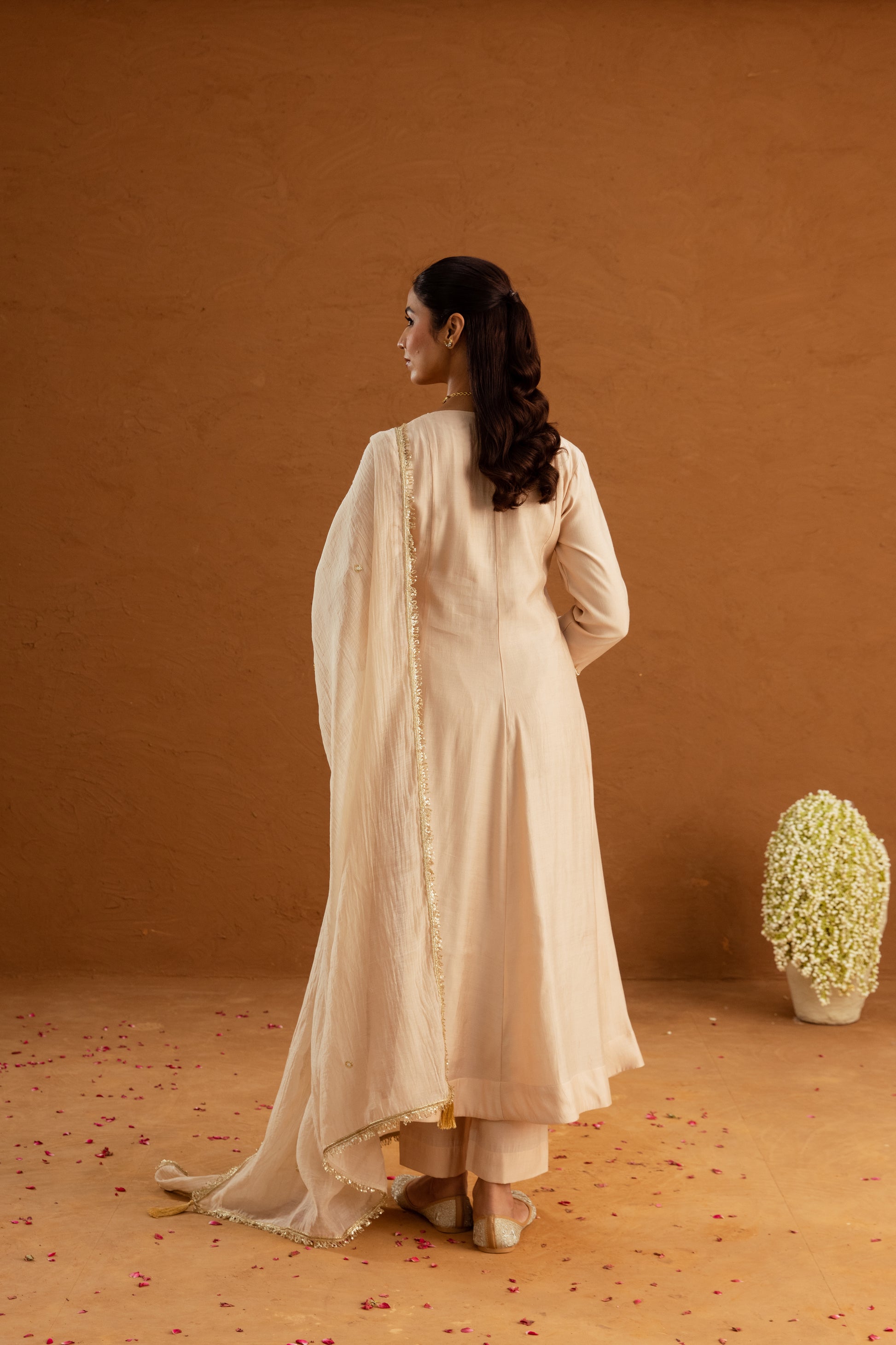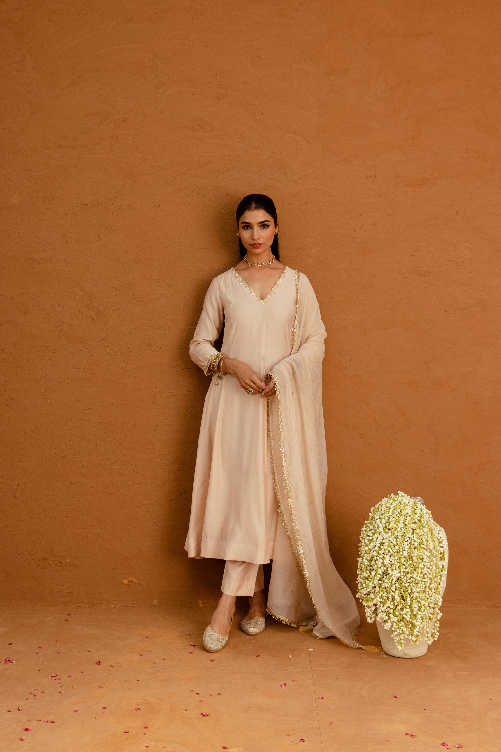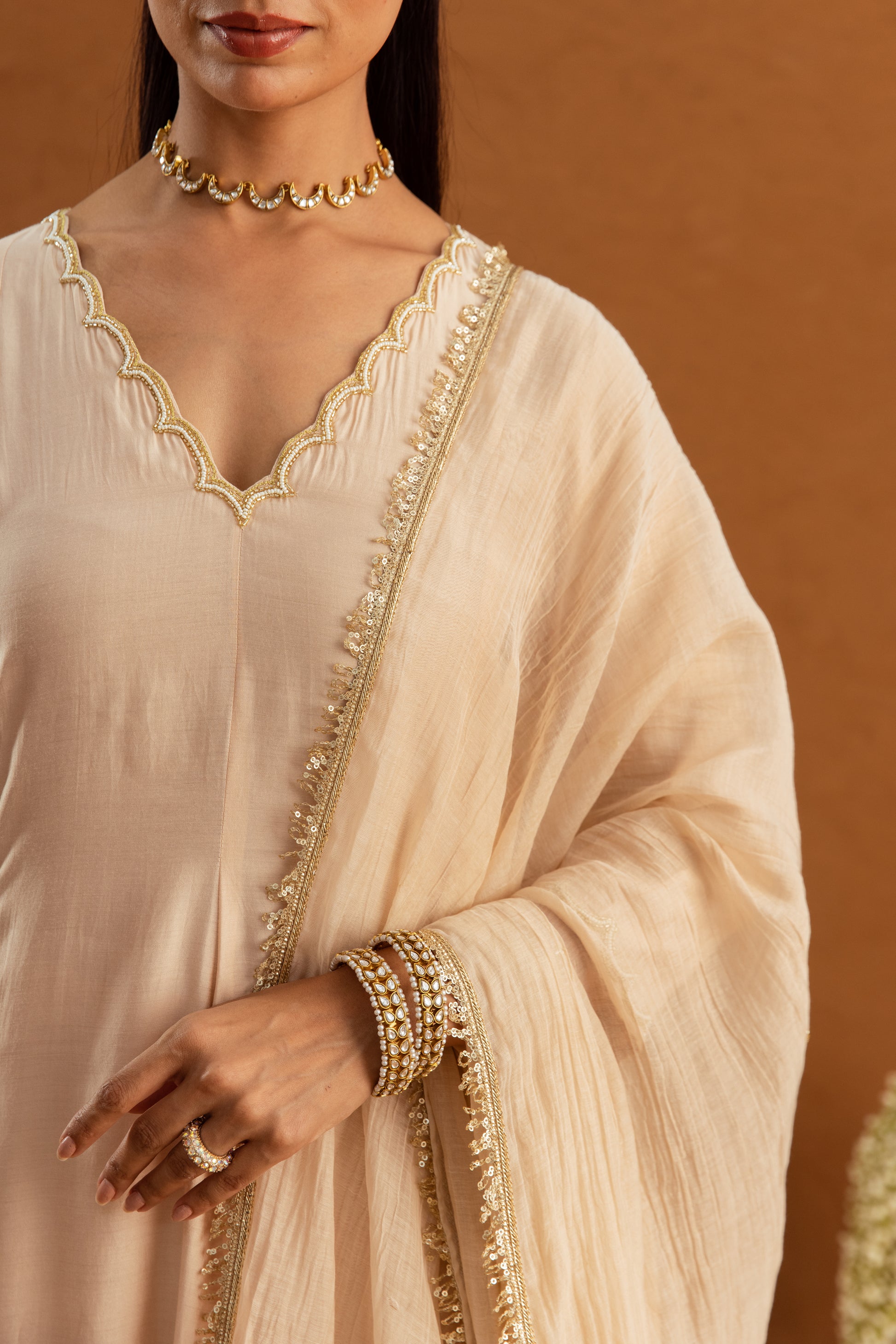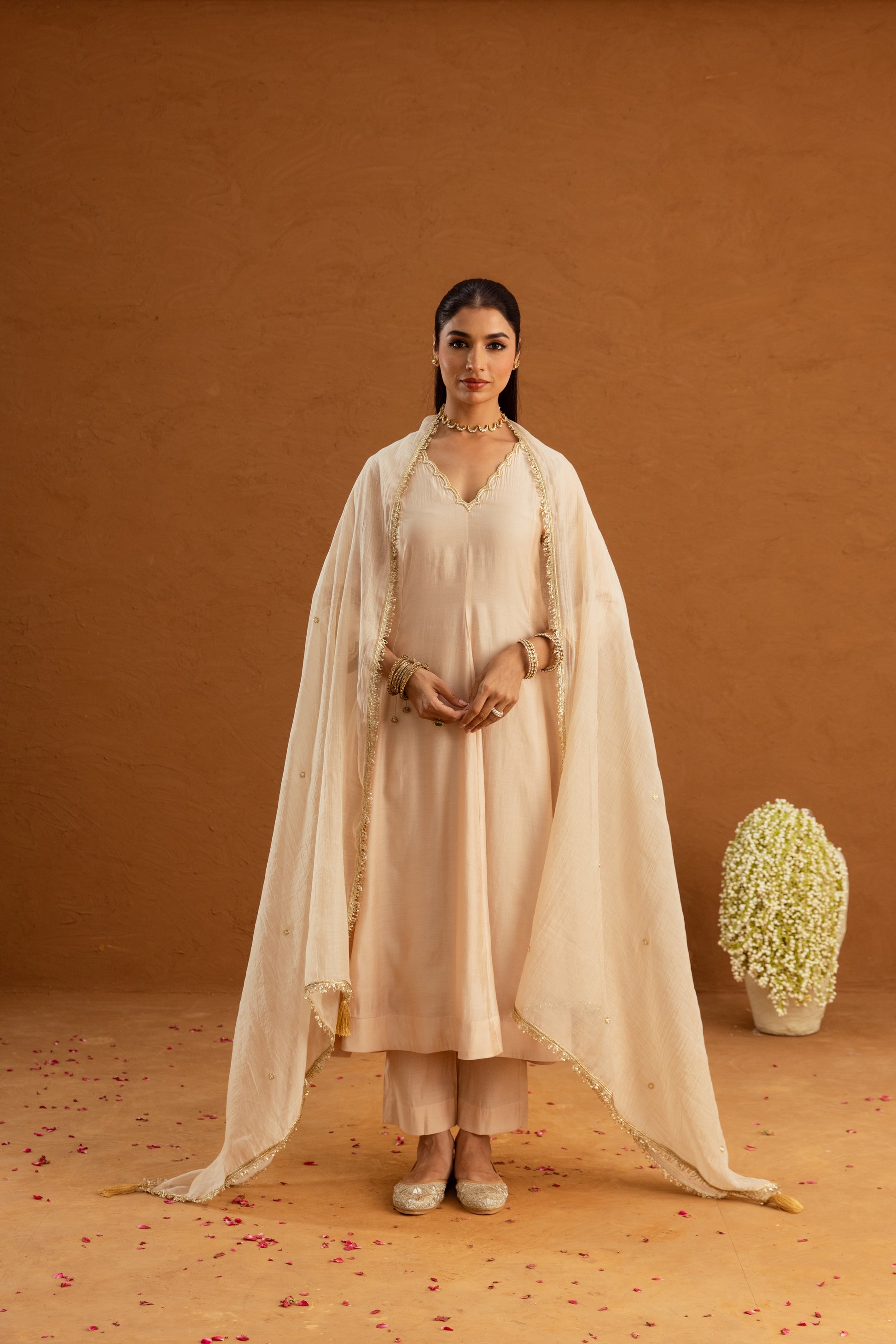 Each suit is crafted from luxurious modal silk, featuring a stunning scalloped beaded neckline that showcases over five hours of meticulous handwork. The shawl, made of exquisite mul chanderi, is elegantly finished with intricate hand detailing, ensuring that every piece is a testament to artisanal craftsmanship. Together, they create an ensemble that radiates sophistication and grace.