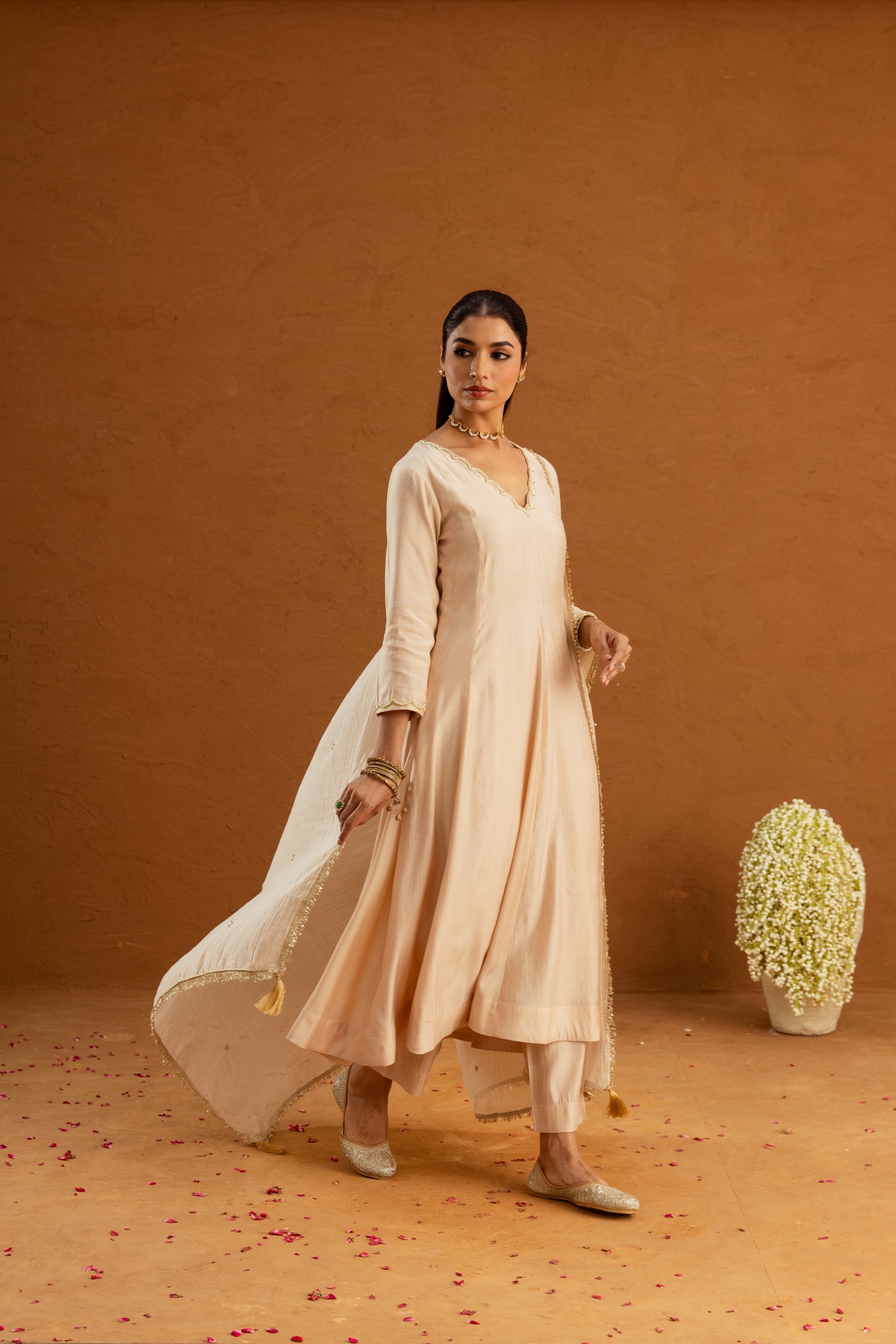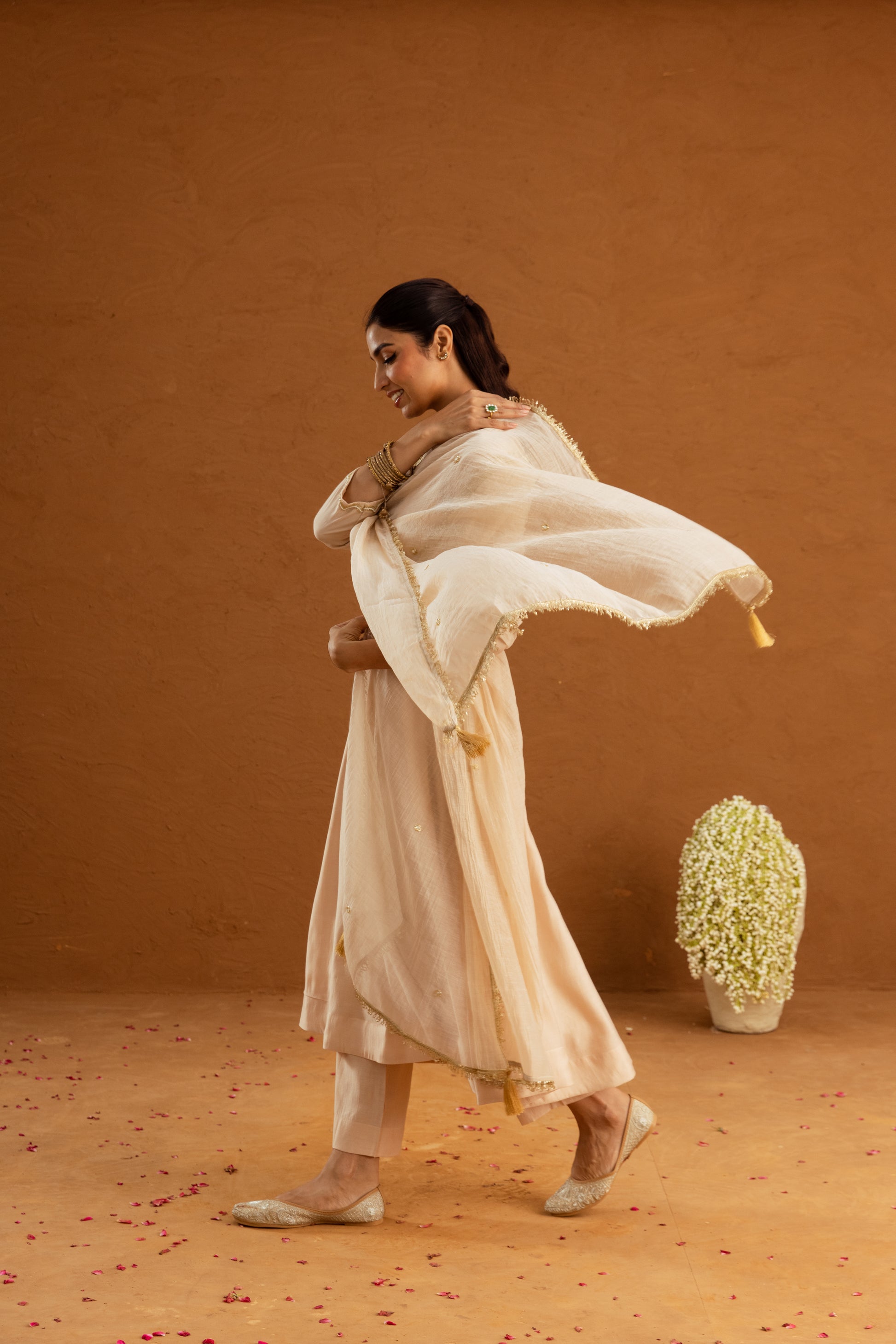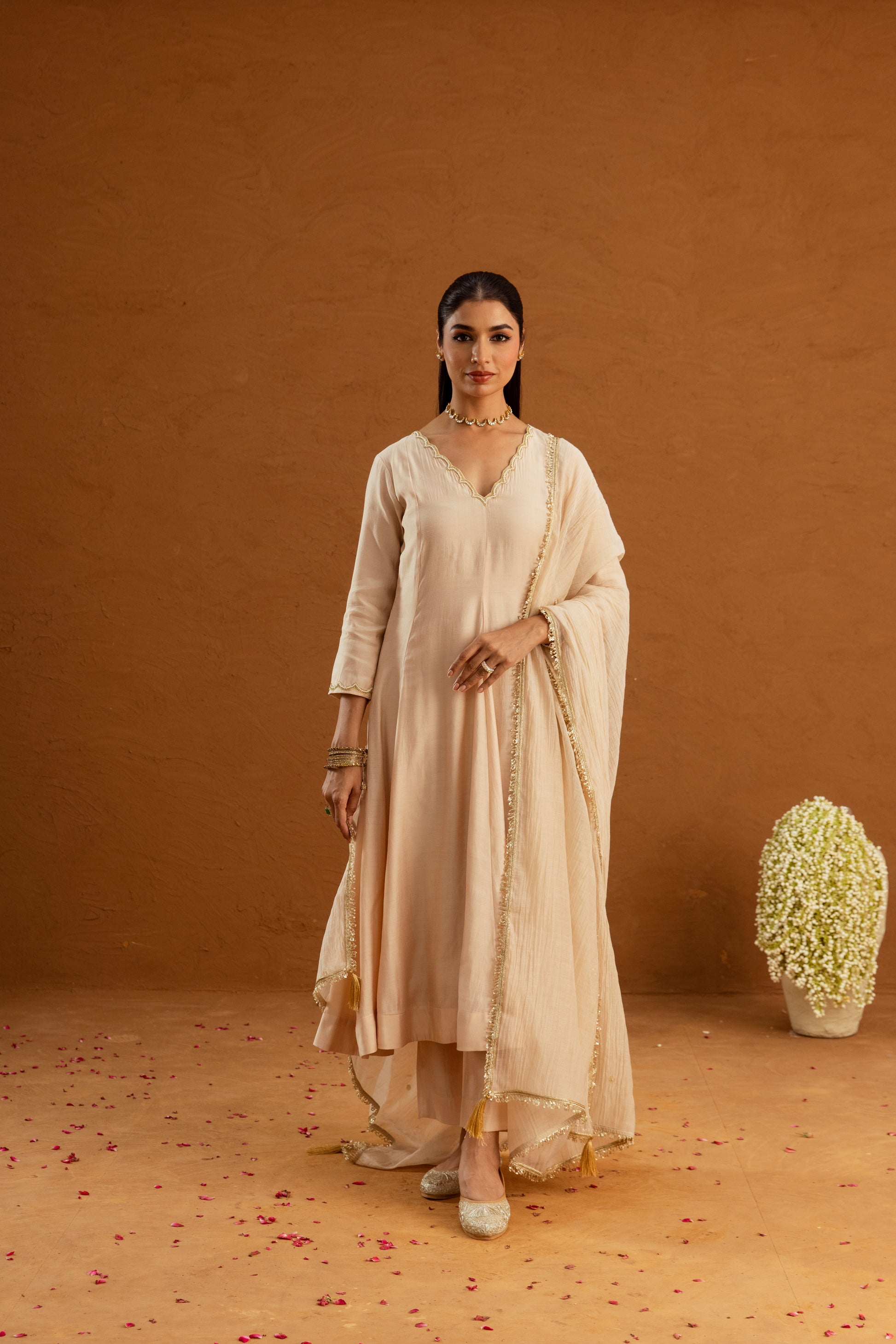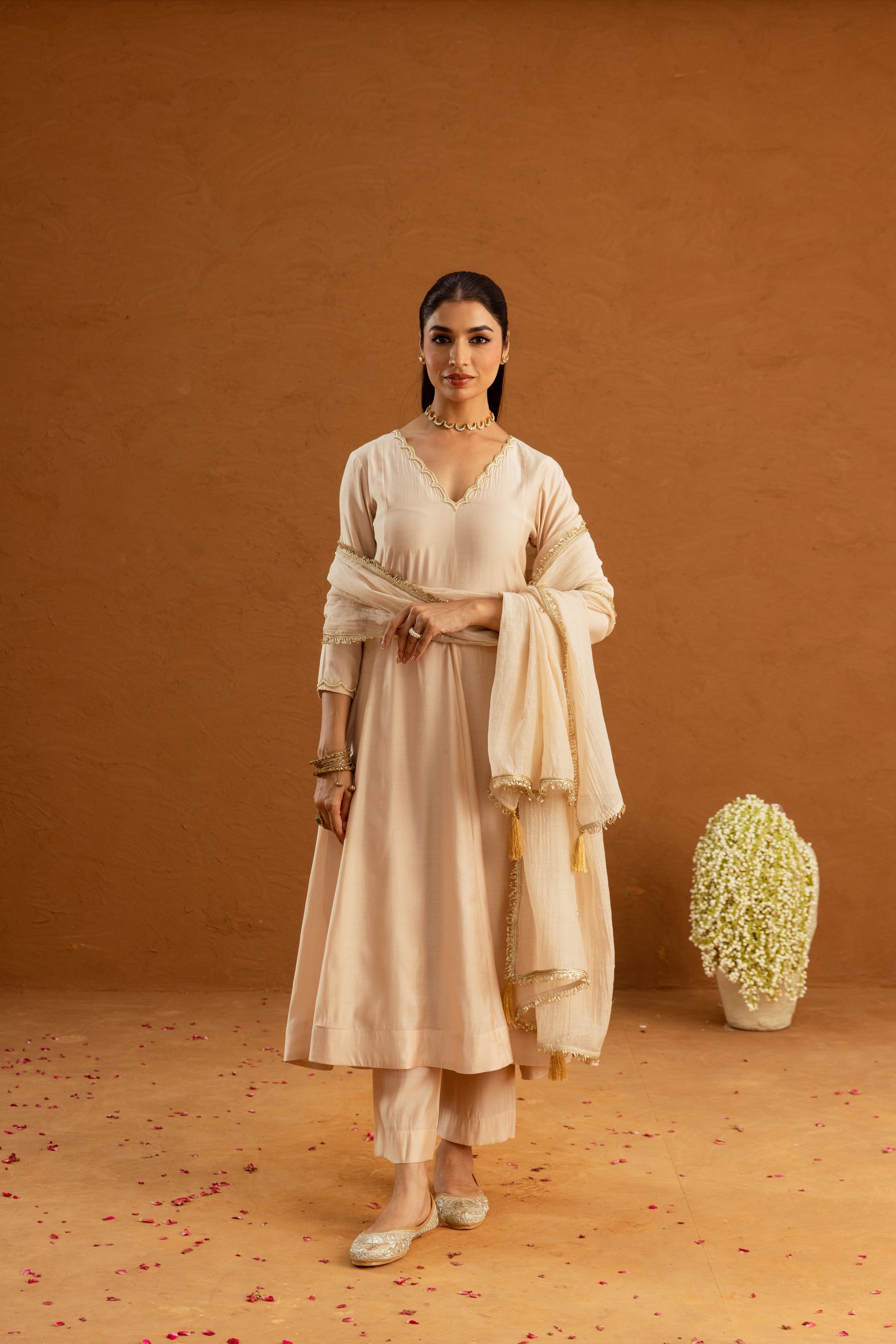 Each suit is crafted from luxurious modal silk, featuring a stunning scalloped beaded neckline that showcases over five hours of meticulous handwork. The shawl, made of exquisite mul chanderi, is elegantly finished with intricate hand detailing, ensuring that every piece is a testament to artisanal craftsmanship. Together, they create an ensemble that radiates sophistication and grace.