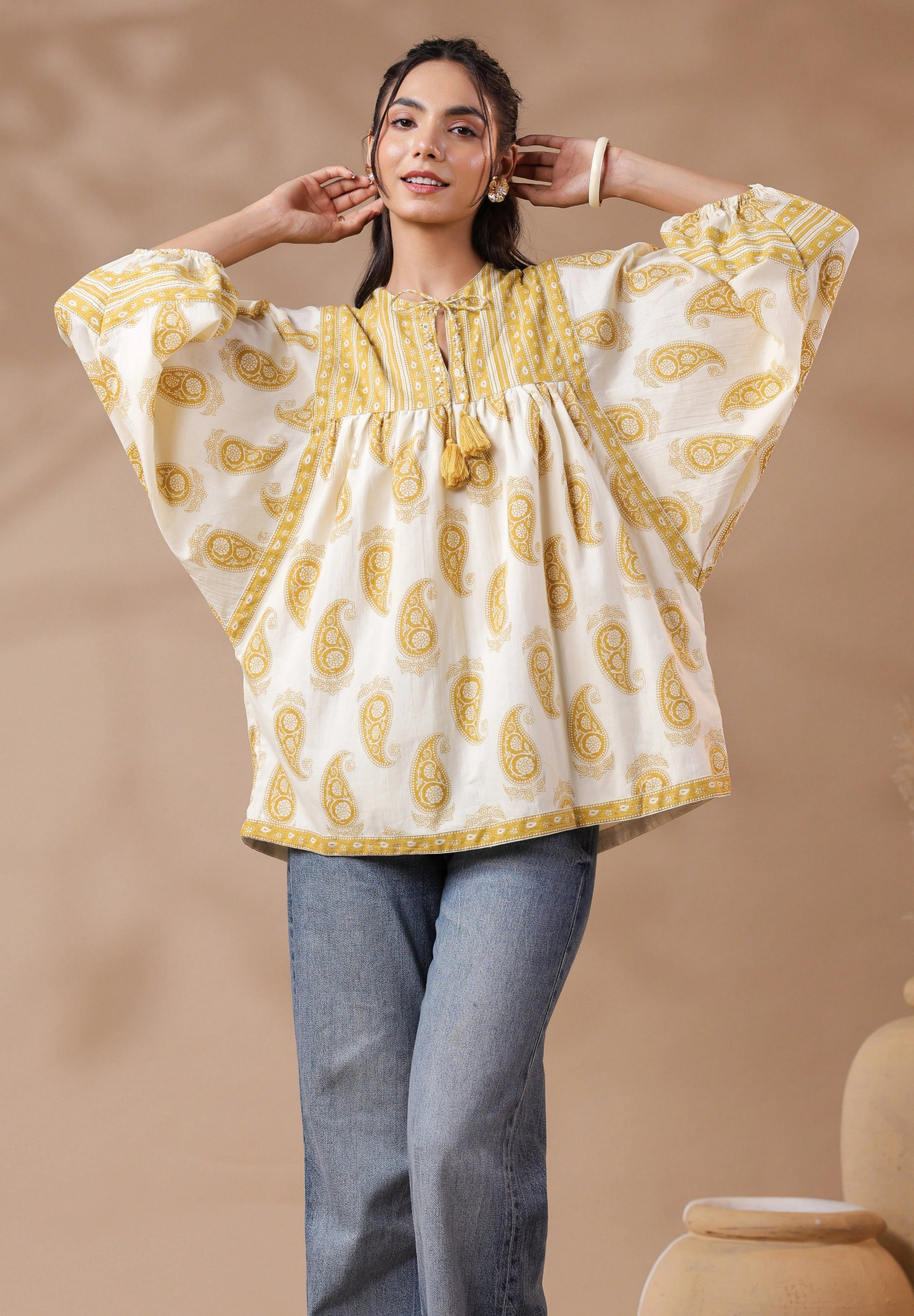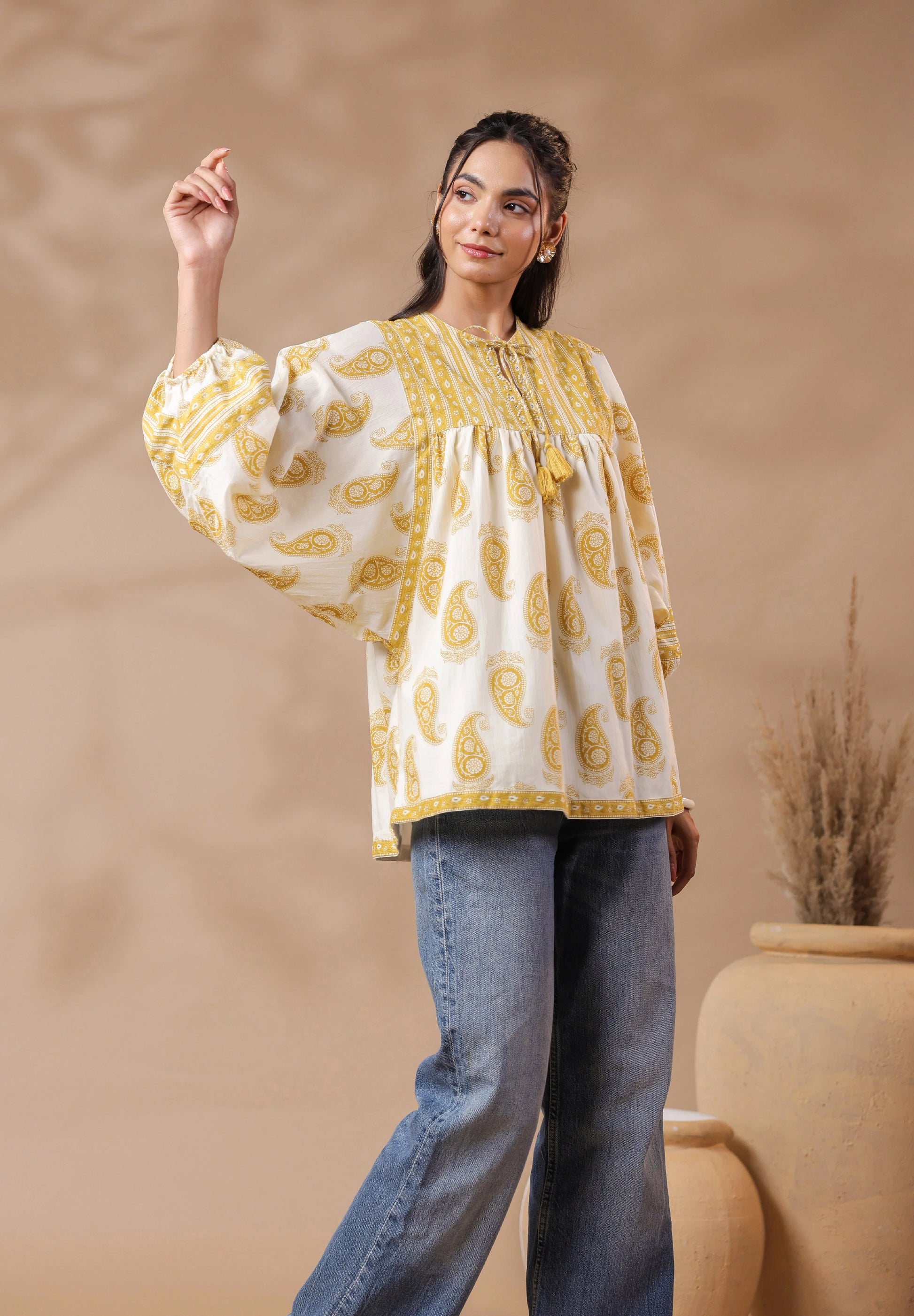 Cream Hand-Block Printed Boho Volume Sleeved Top