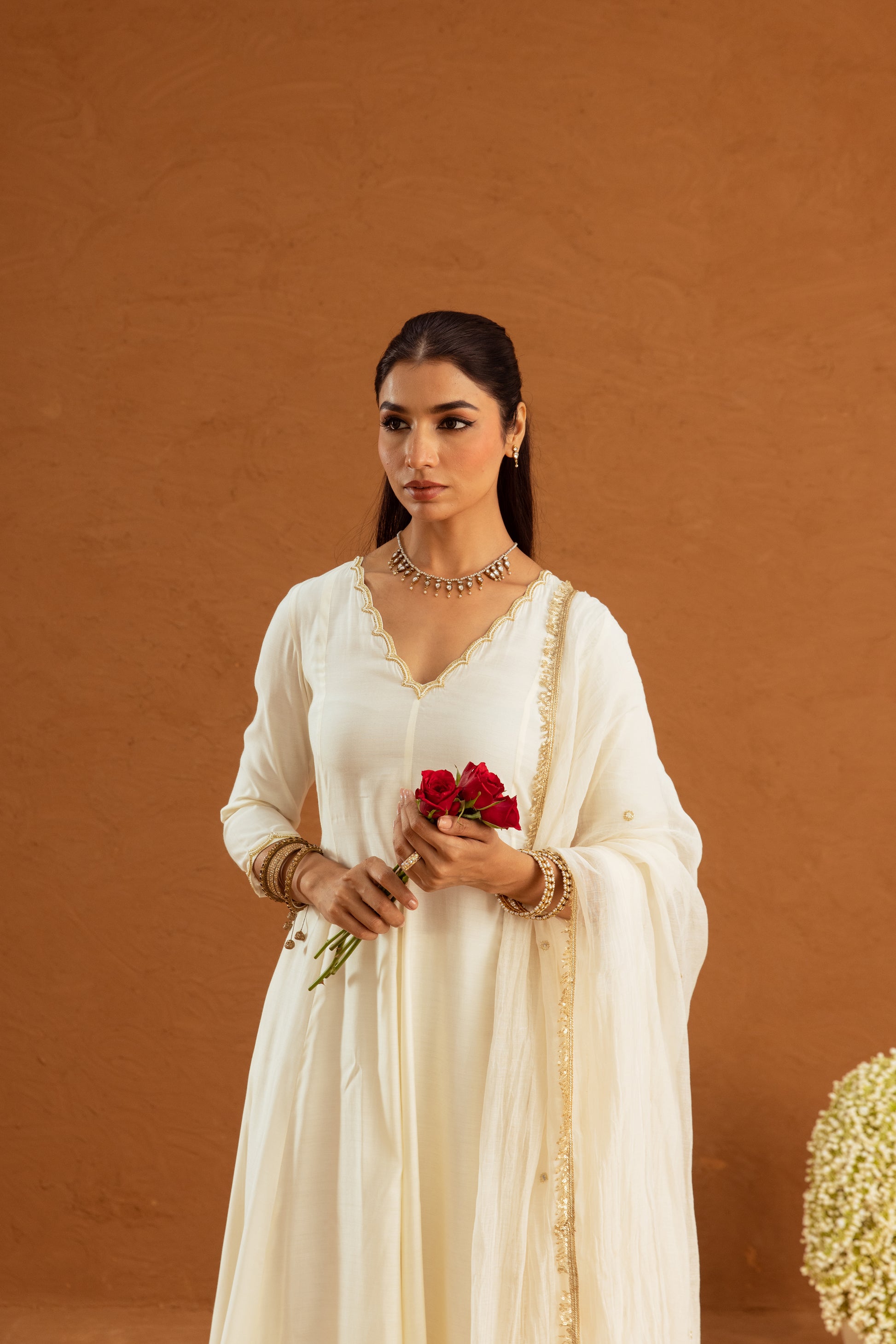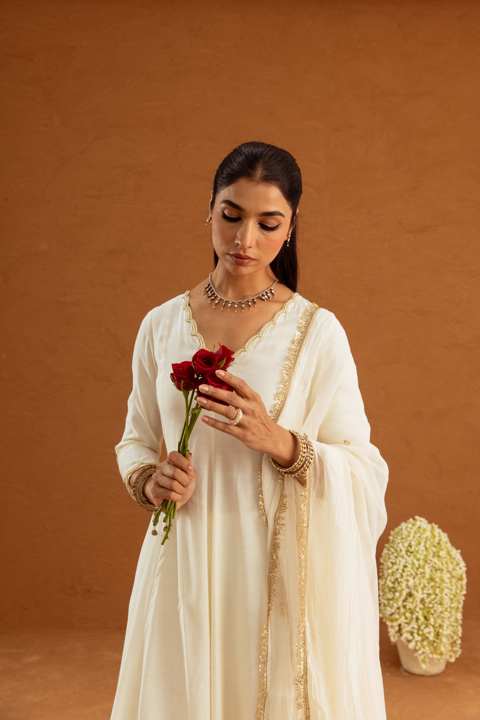 Each suit is crafted from luxurious modal silk, featuring a stunning scalloped beaded neckline that showcases over five hours of meticulous handwork. The shawl, made of exquisite mul chanderi, is elegantly finished with intricate hand detailing, ensuring that every piece is a testament to artisanal craftsmanship. Together, they create an ensemble that radiates sophistication and grace.