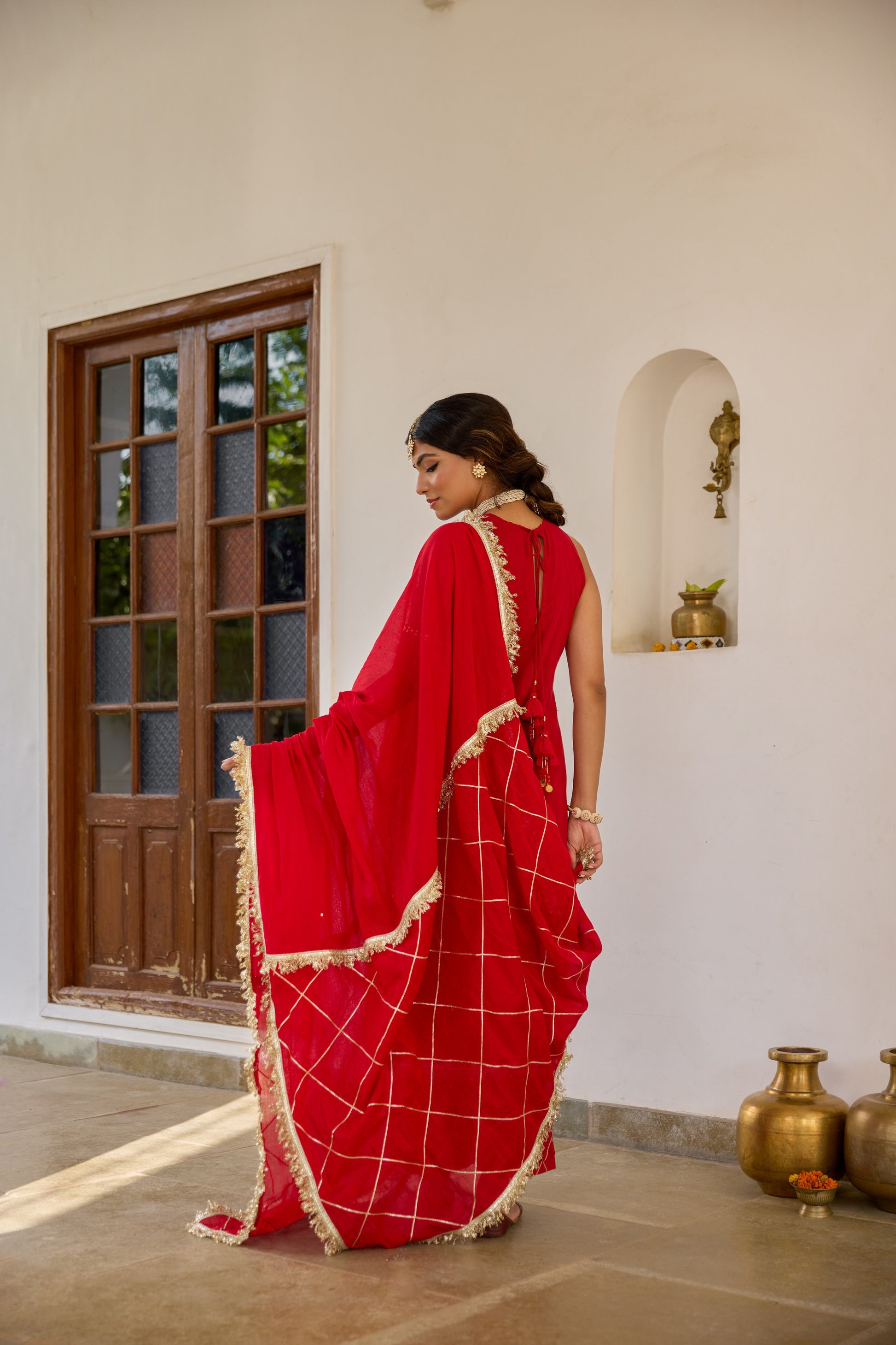 Soft mulmul in vibrant kumkum, featuring a deep back keyhole with handmade hangings that reflect Jaipur’s handcrafted charm. The palazzo glimmers with gotta work, while the dupatta’s panel detailing pays homage to the city’s rich heritage.