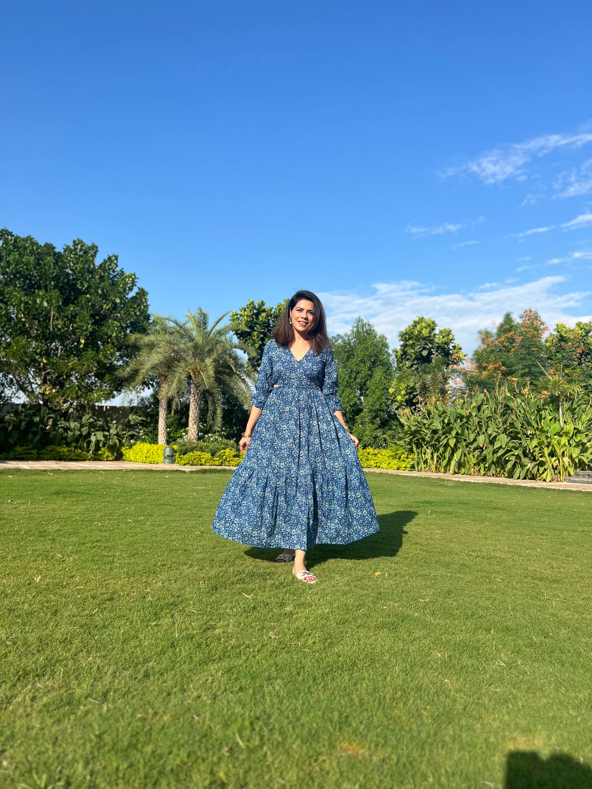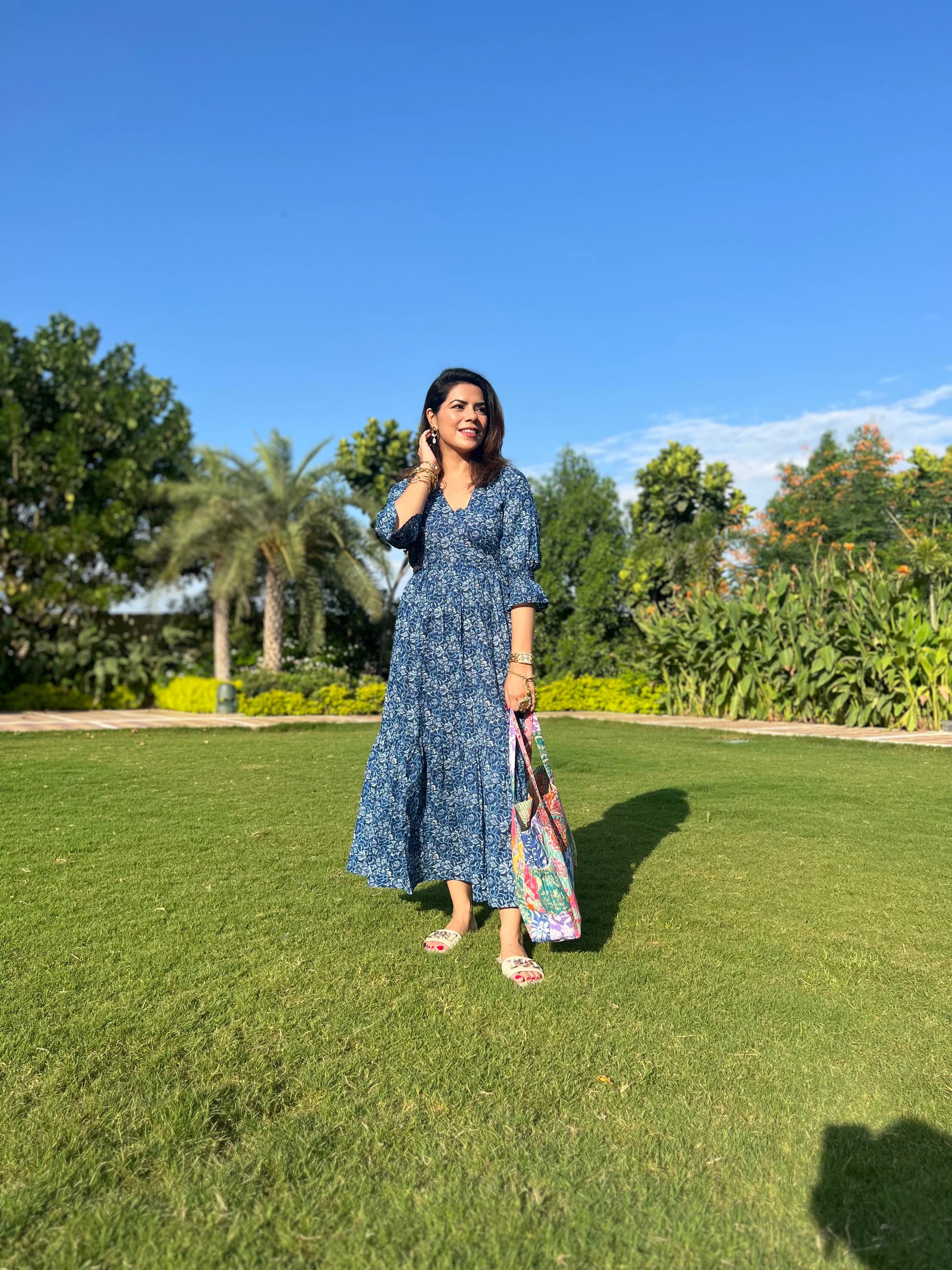 Indigo printed cutout dress had elasticted waist and tier skirt