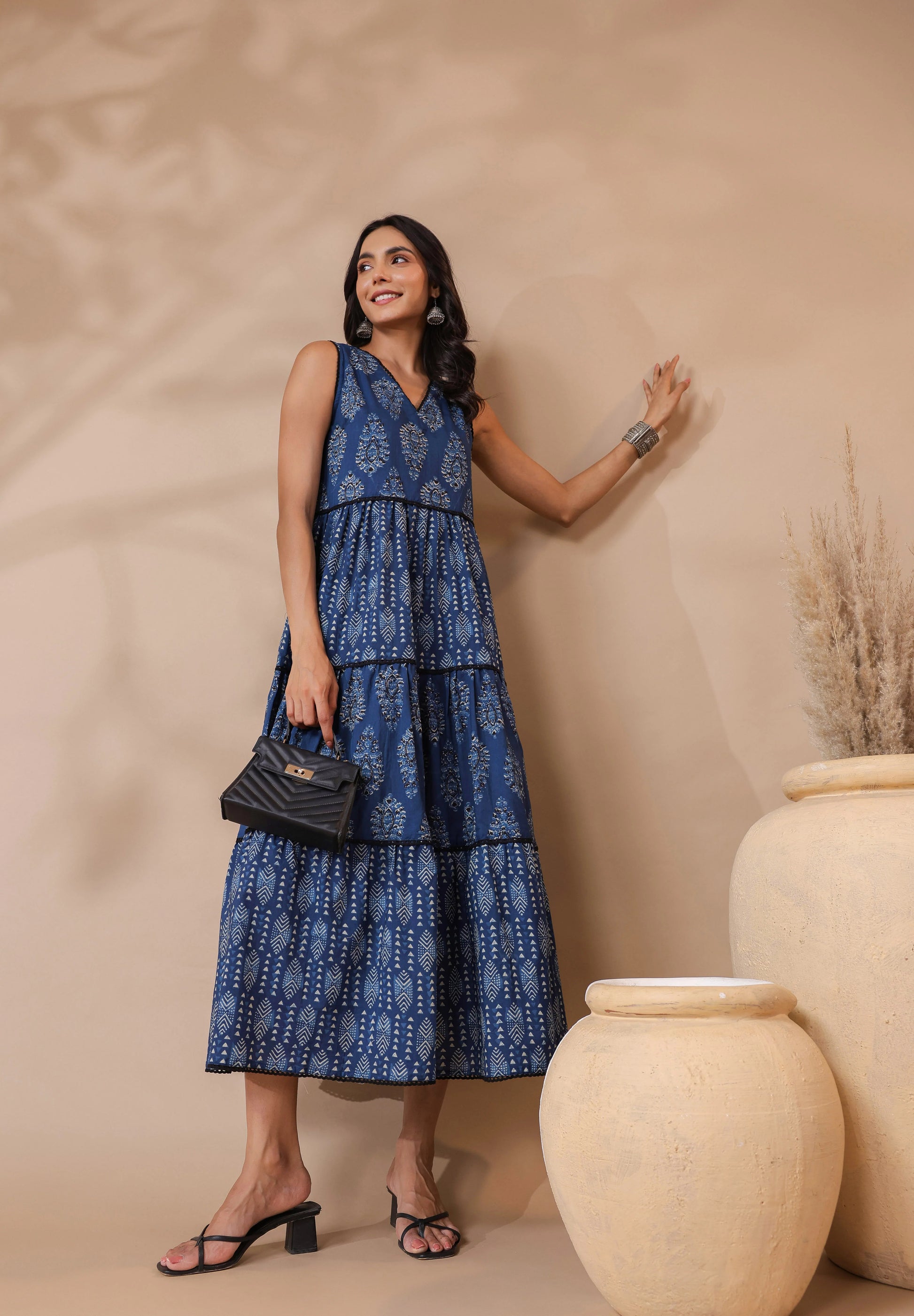 Embrace effortless summer style with this beautifully crafted V-neck handblock printed maxi dress.The soft cotton fabric ensures all-day comfort, while the intricate cotton waist detailing adds a flattering touch. Whether you're heading out for a brunch, a casual day in the city, or a summer getaway, this breezy and breathable dress is the perfect pick for warm weather days.