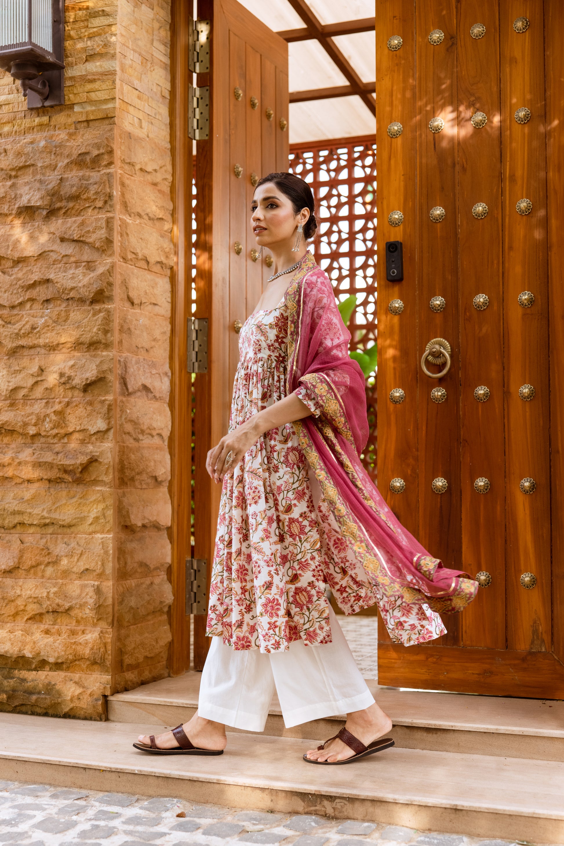 Step into effortless elegance with our 3-piece Nyra cut suit designed for festive charm. Crafted from breathable, high-quality fabric, the suit features traditional handblock prints enhanced with delicate handwork, adding a touch of artisanal sophistication. The ensemble includes a coordinating contrast shawl, completing the look with graceful drape and vibrant flair.