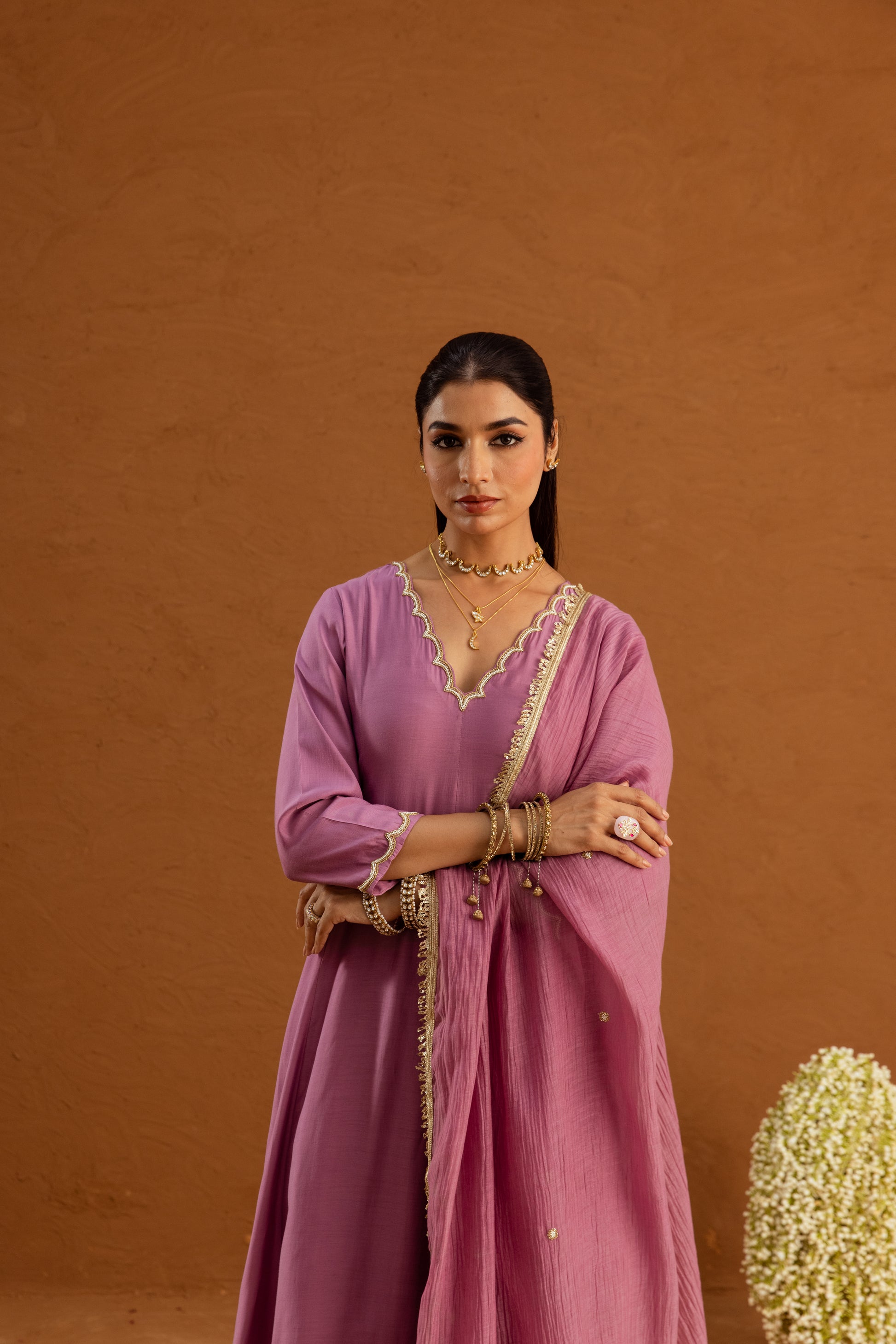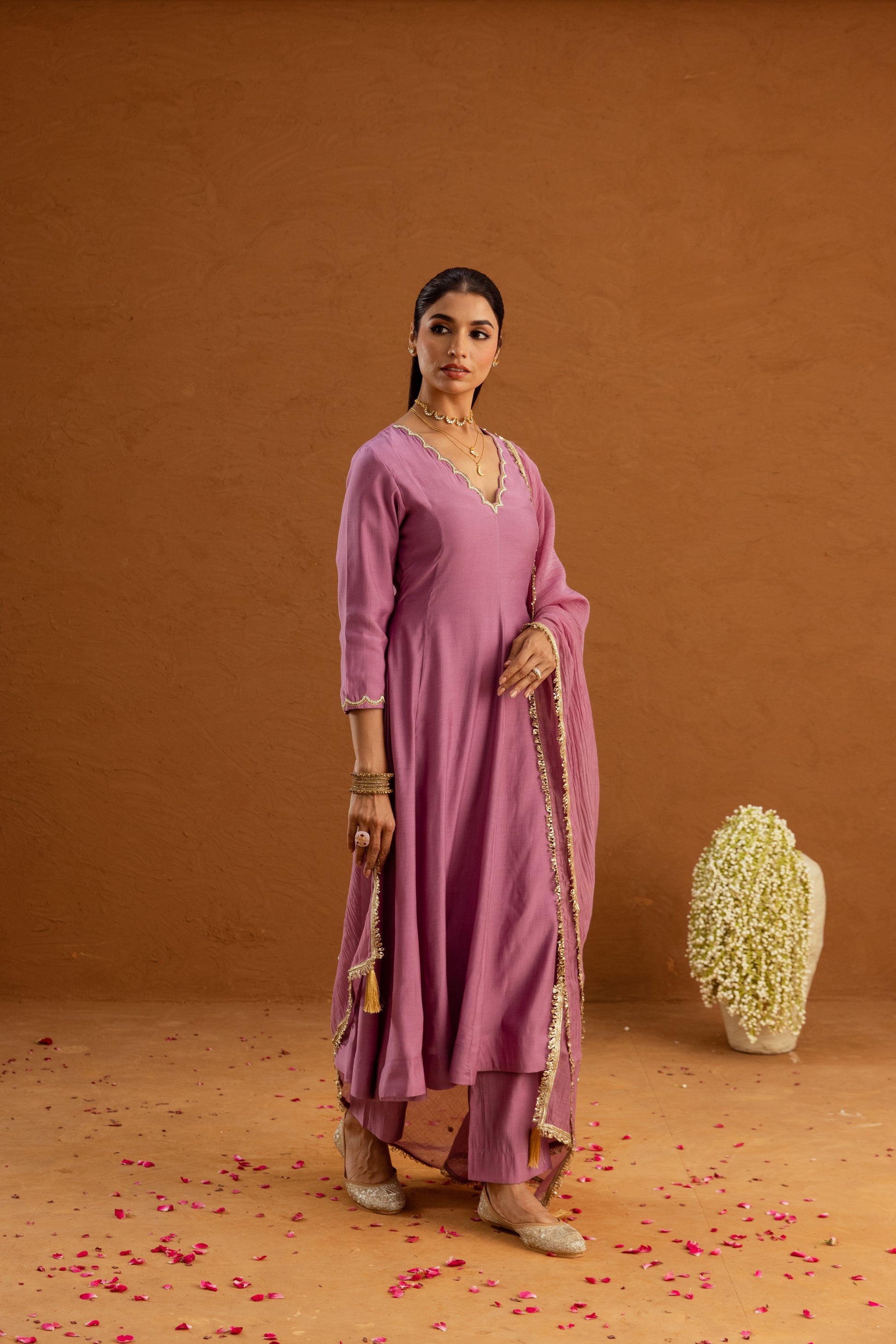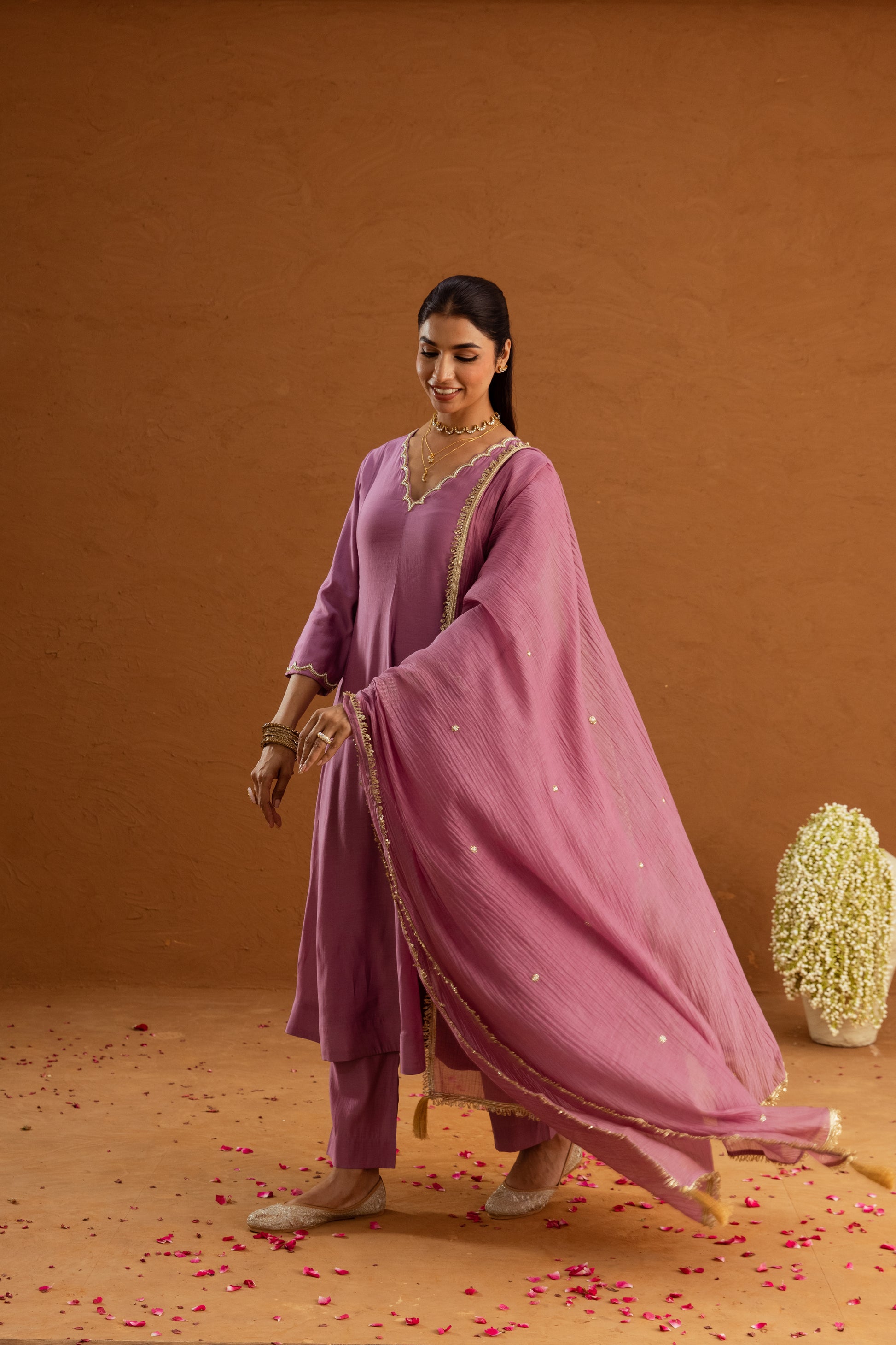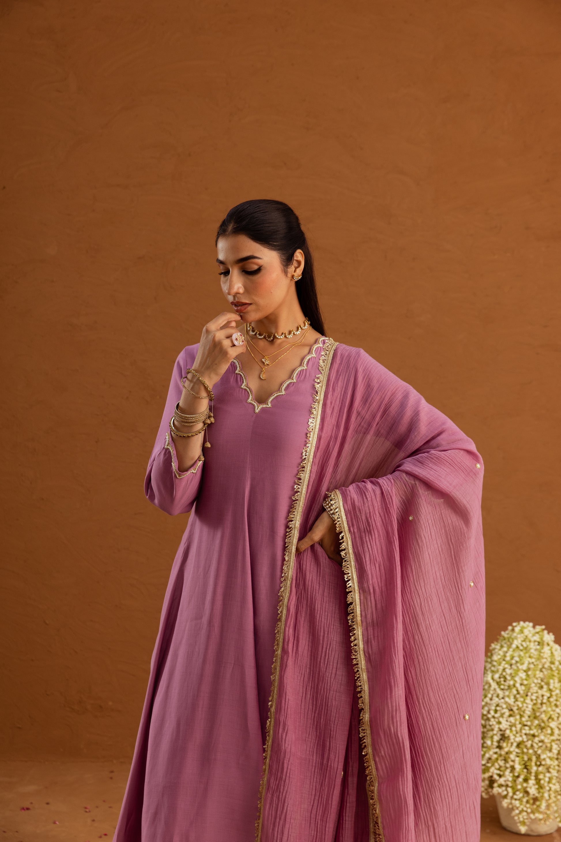 Each suit is crafted from luxurious modal silk, featuring a stunning scalloped beaded neckline that showcases over five hours of meticulous handwork. The shawl, made of exquisite mul chanderi, is elegantly finished with intricate hand detailing, ensuring that every piece is a testament to artisanal craftsmanship. Together, they create an ensemble that radiates sophistication and grace.