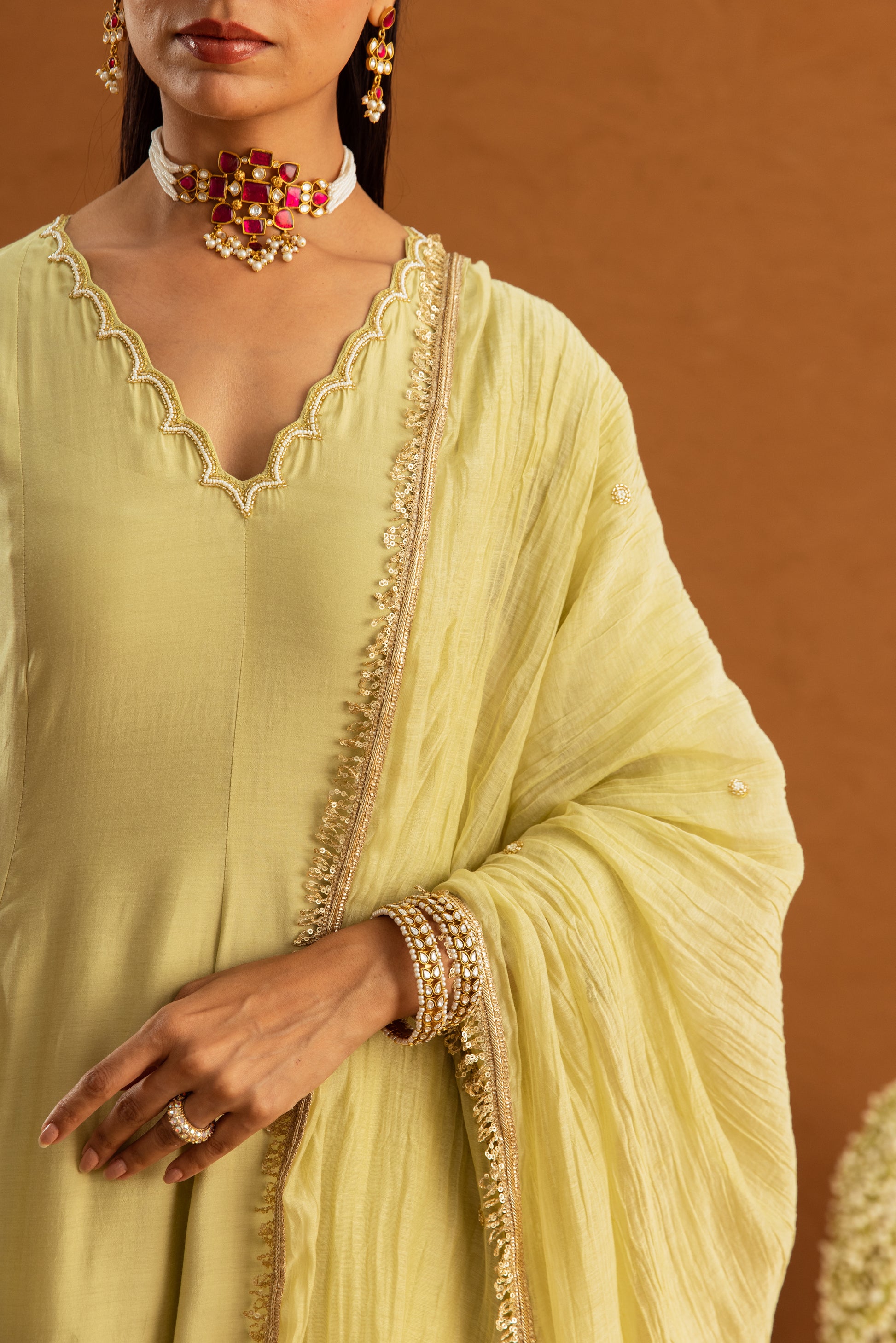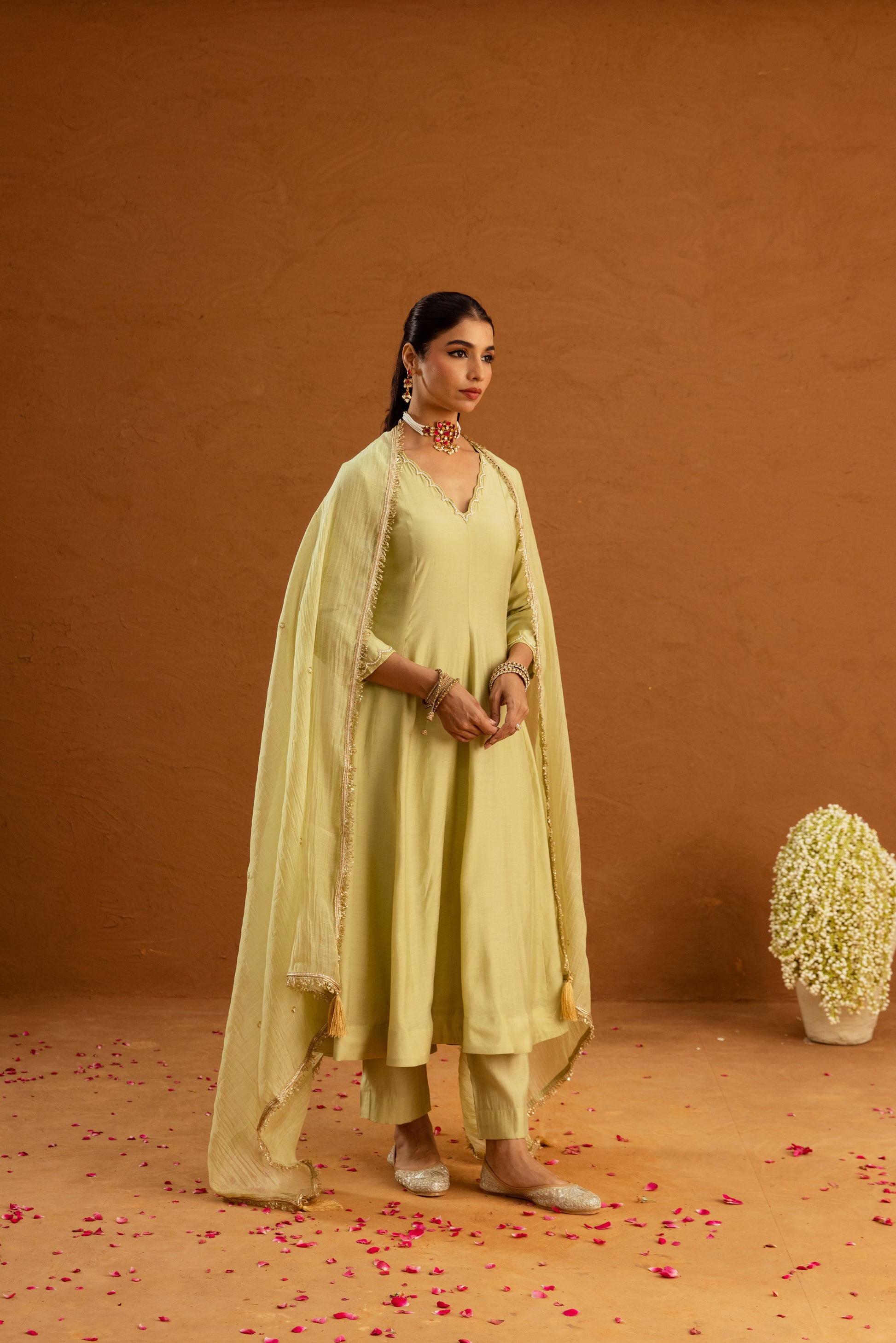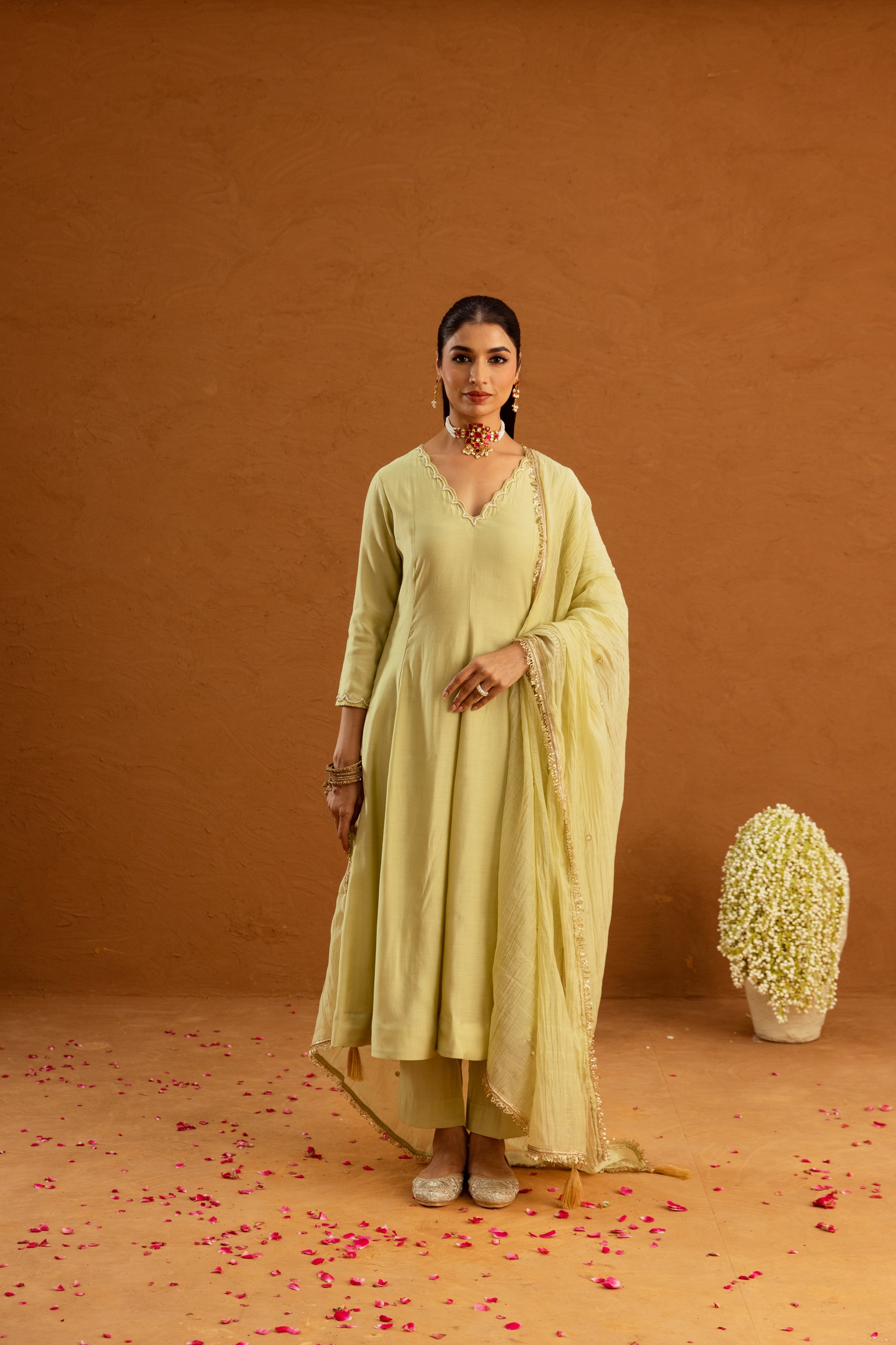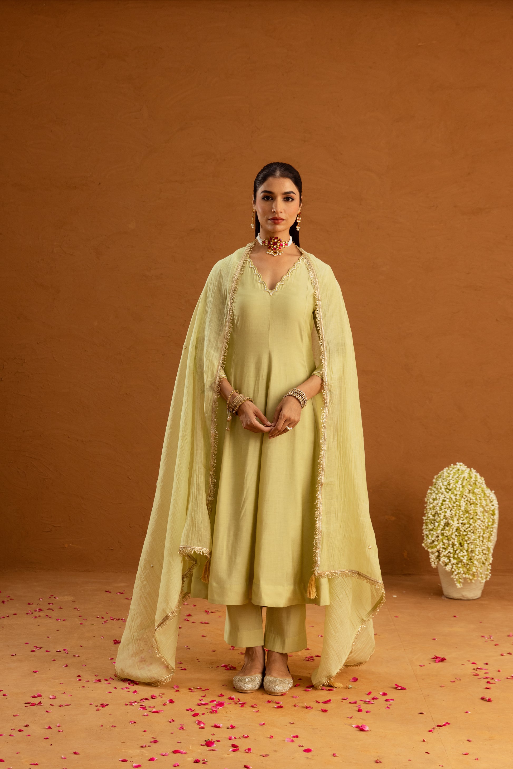 Each suit is crafted from luxurious modal silk, featuring a stunning scalloped beaded neckline that showcases over five hours of meticulous handwork. The shawl, made of exquisite mul chanderi, is elegantly finished with intricate hand detailing, ensuring that every piece is a testament to artisanal craftsmanship. Together, they create an ensemble that radiates sophistication and grace.