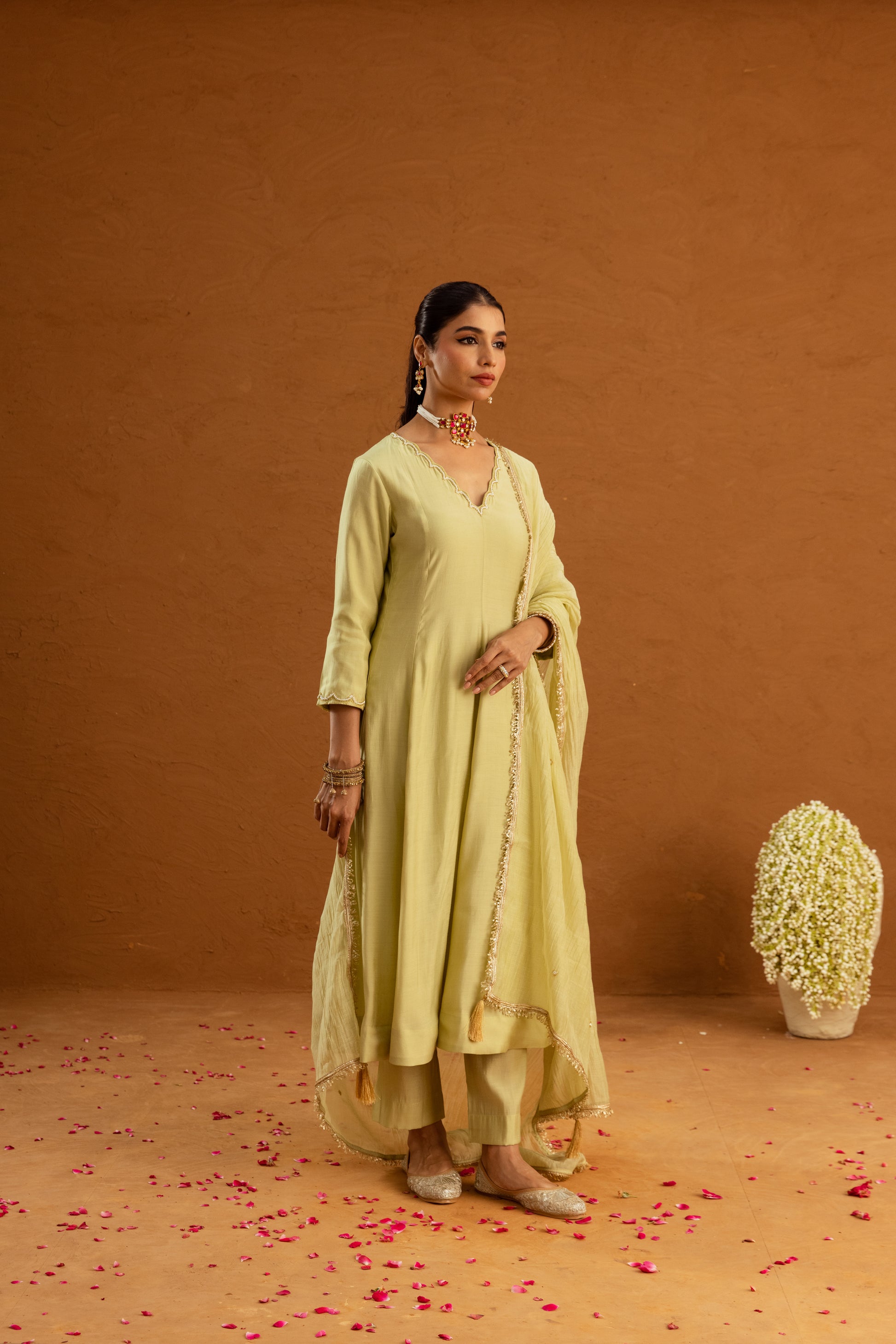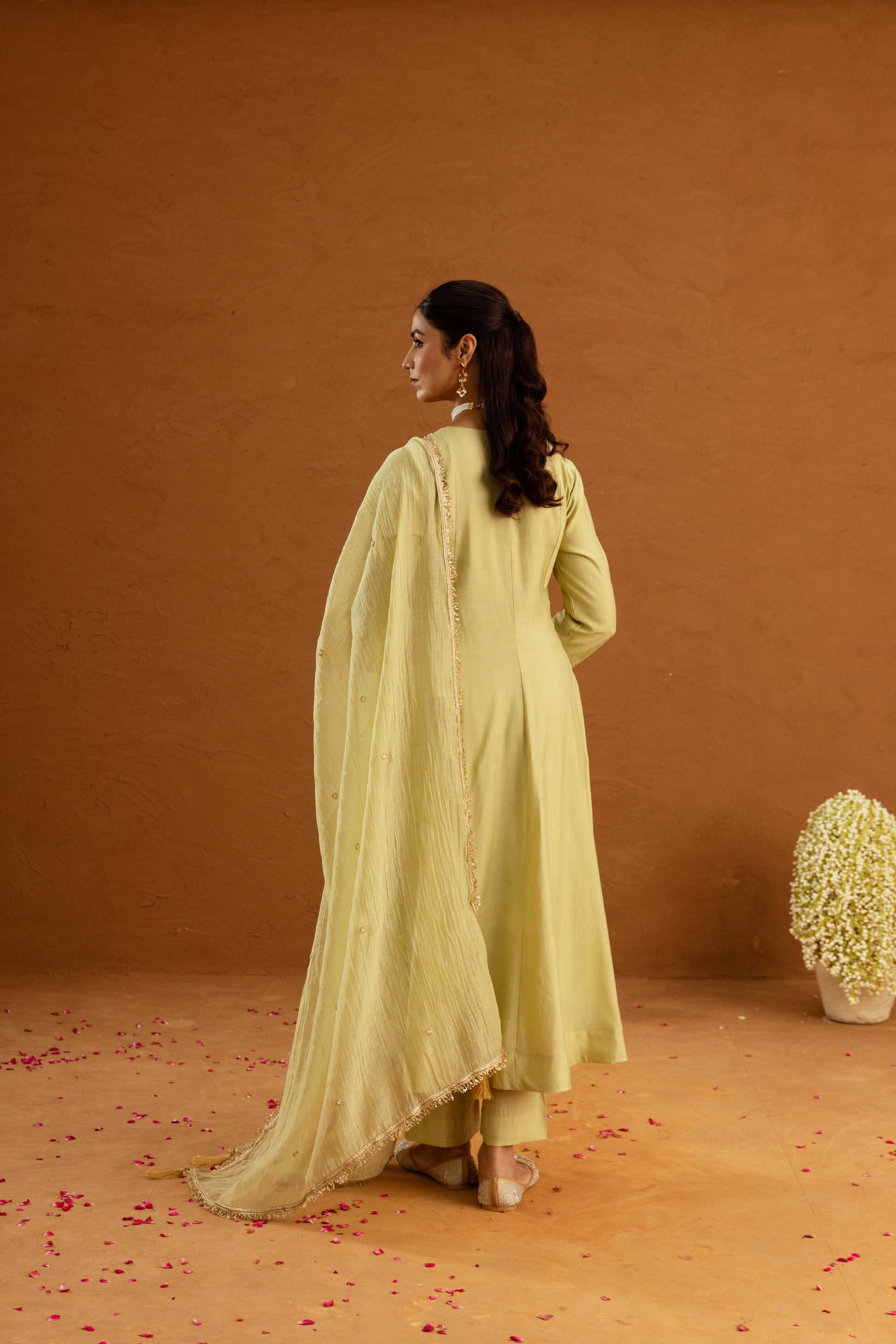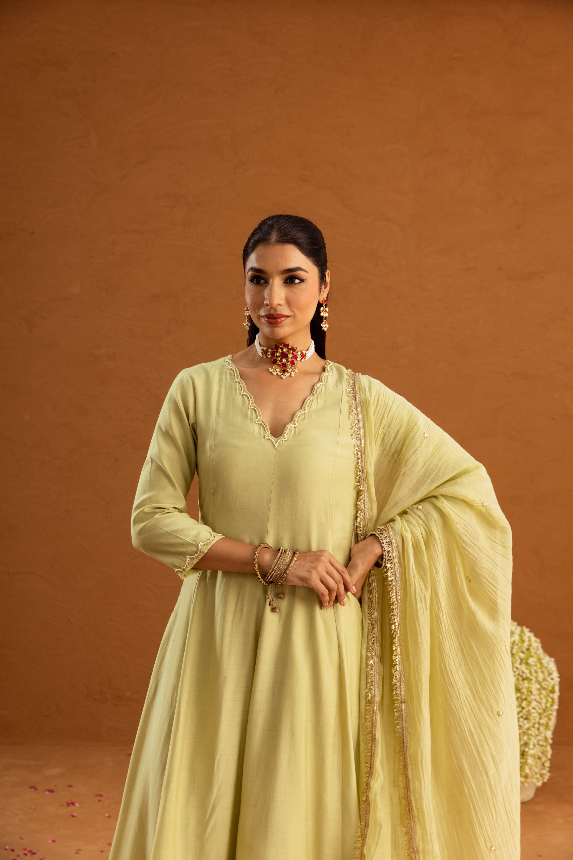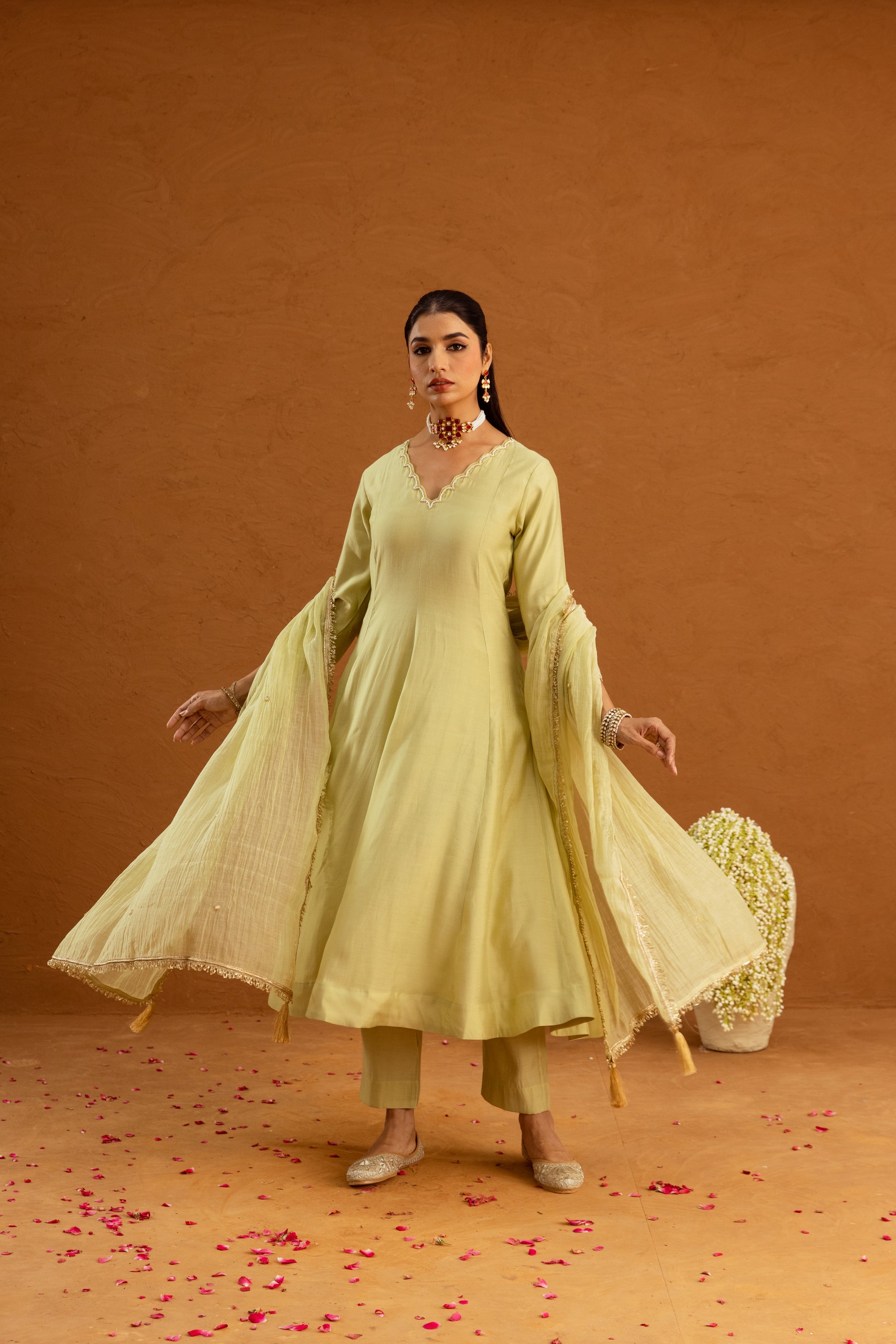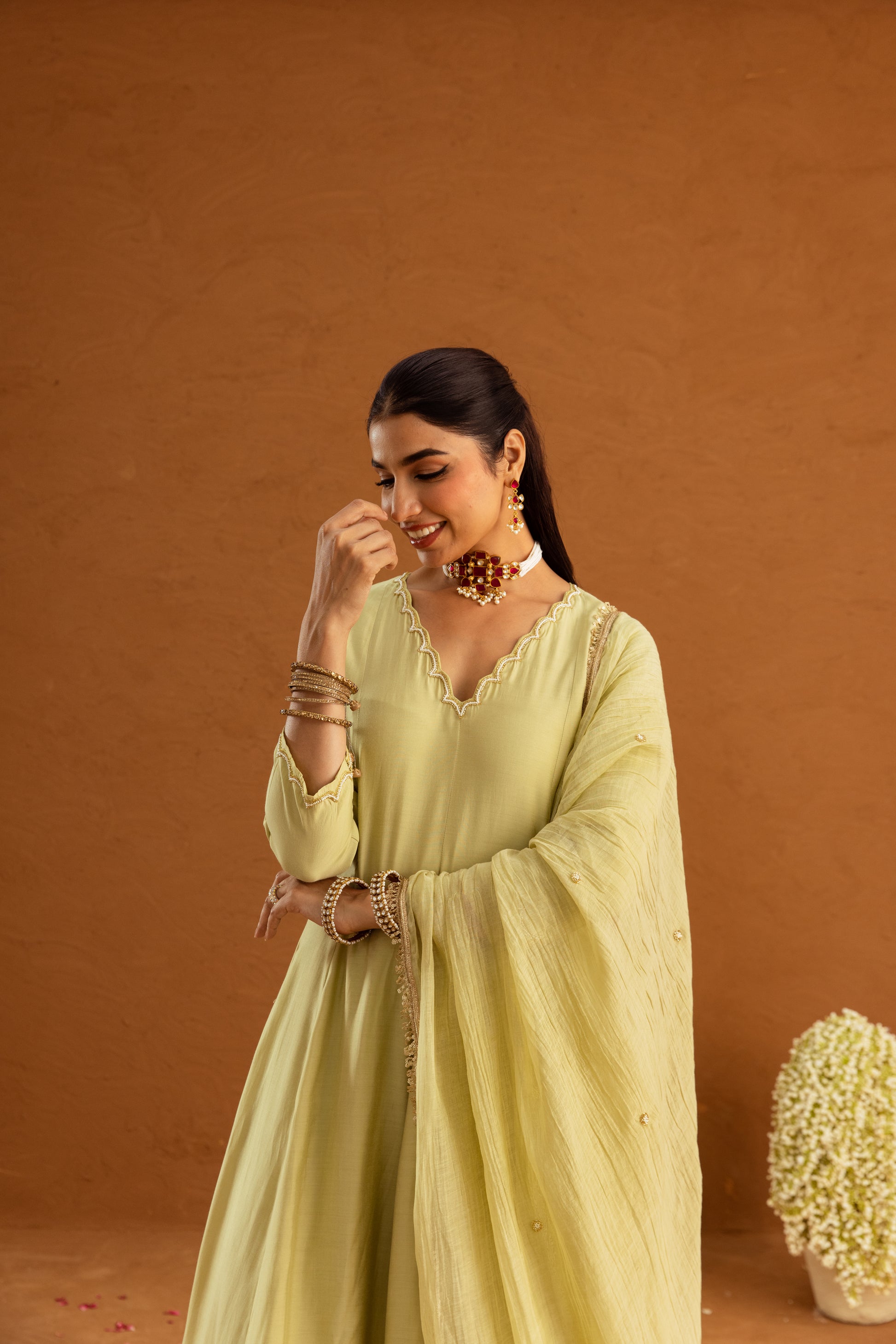 Each suit is crafted from luxurious modal silk, featuring a stunning scalloped beaded neckline that showcases over five hours of meticulous handwork. The shawl, made of exquisite mul chanderi, is elegantly finished with intricate hand detailing, ensuring that every piece is a testament to artisanal craftsmanship. Together, they create an ensemble that radiates sophistication and grace.