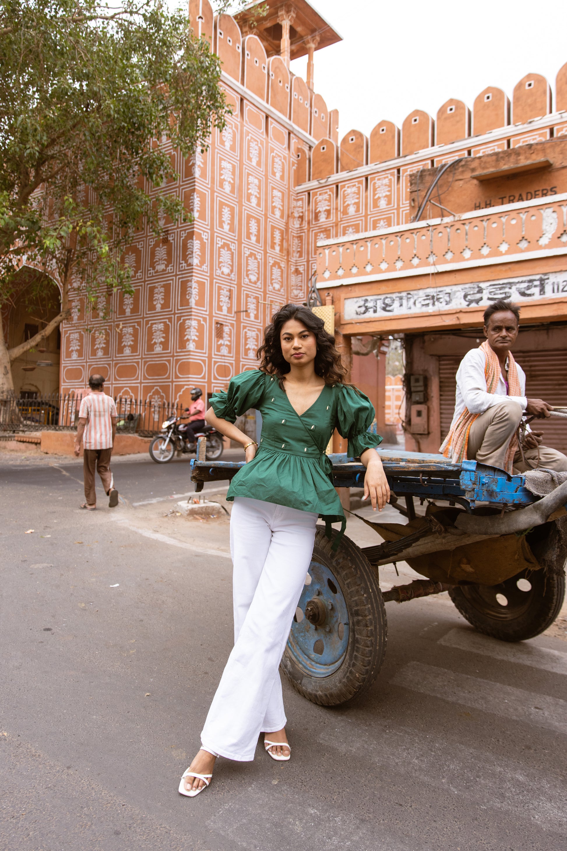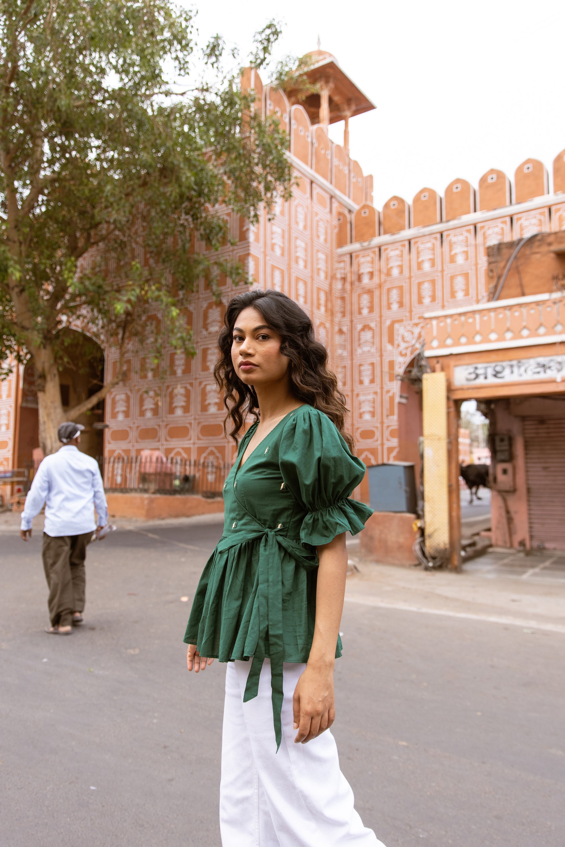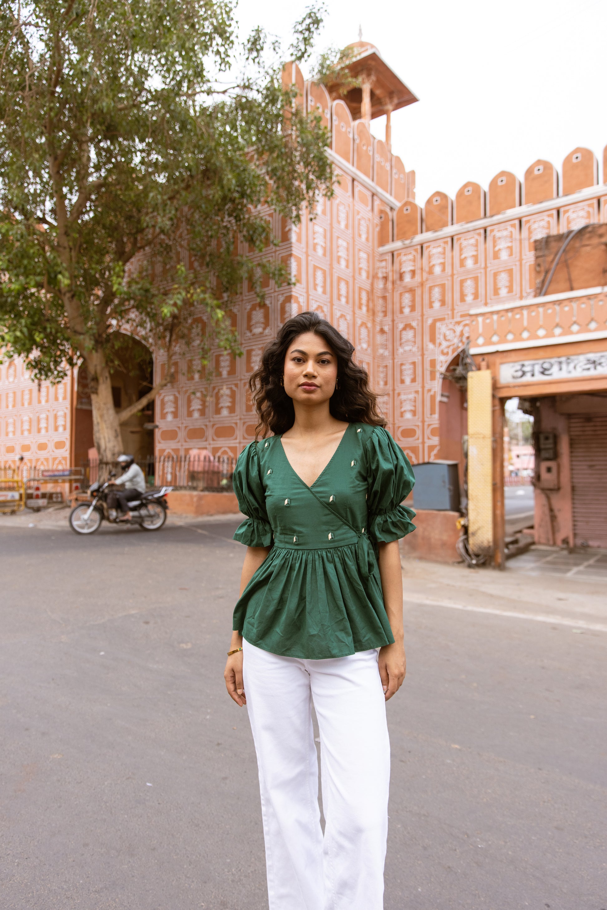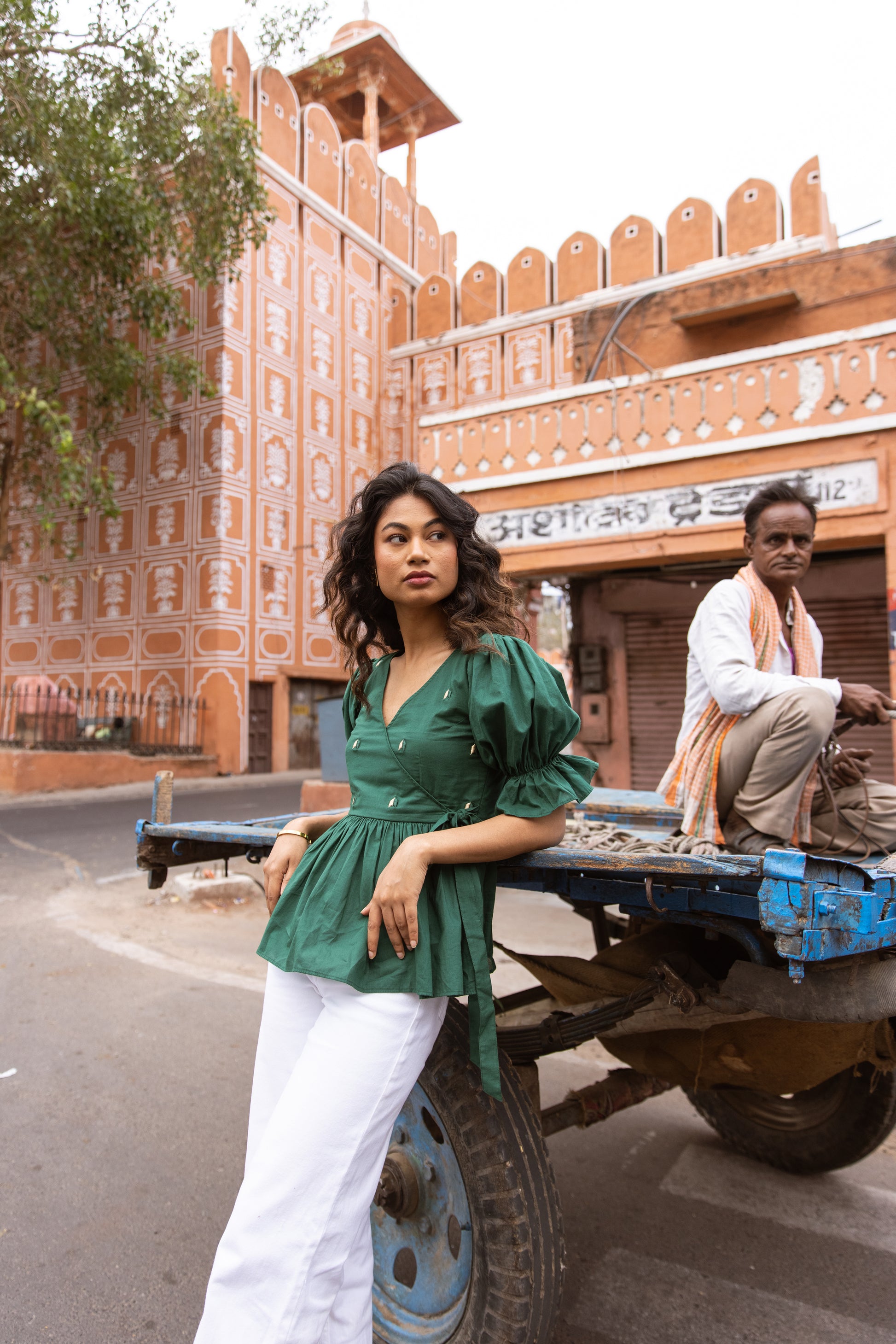 Brighten up your wardrobe with our Pop 'n' Wrap Top—a fresh spin on the beloved wrap dress, now in a versatile top silhouette. Cut from soft, breathable 100% cotton, it features the same intricate bust embroidery, a flattering V-neckline, and statement puff sleeves with ruffled cuffs. The adjustable wrap-front tie lets you customise the fit which makes it perfect for pairing with high-waisted skirts, jeans, or trousers.