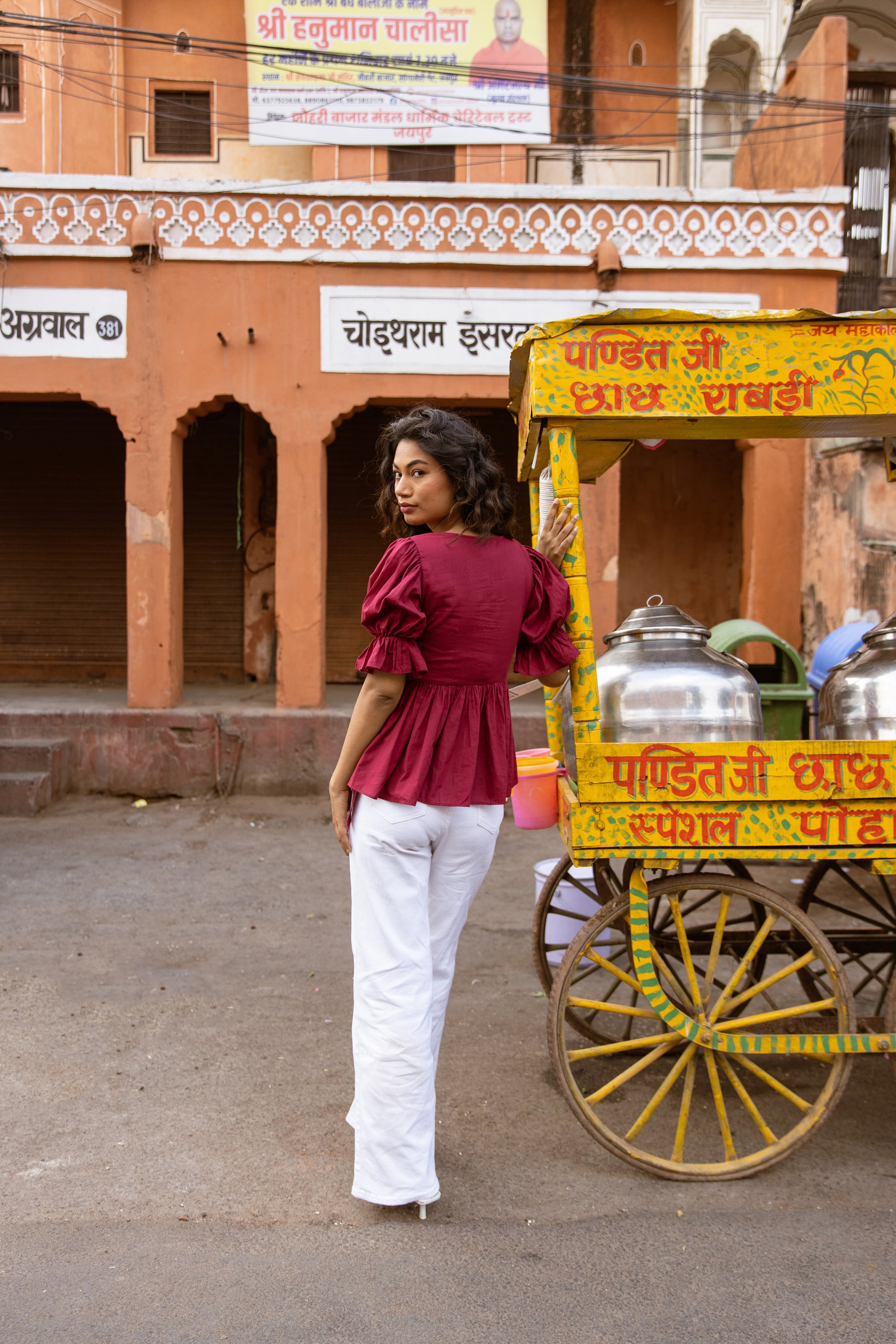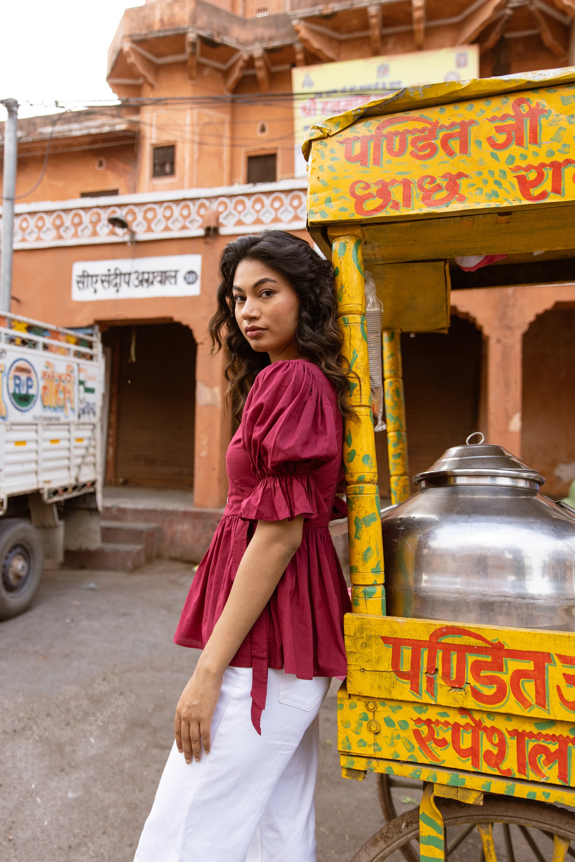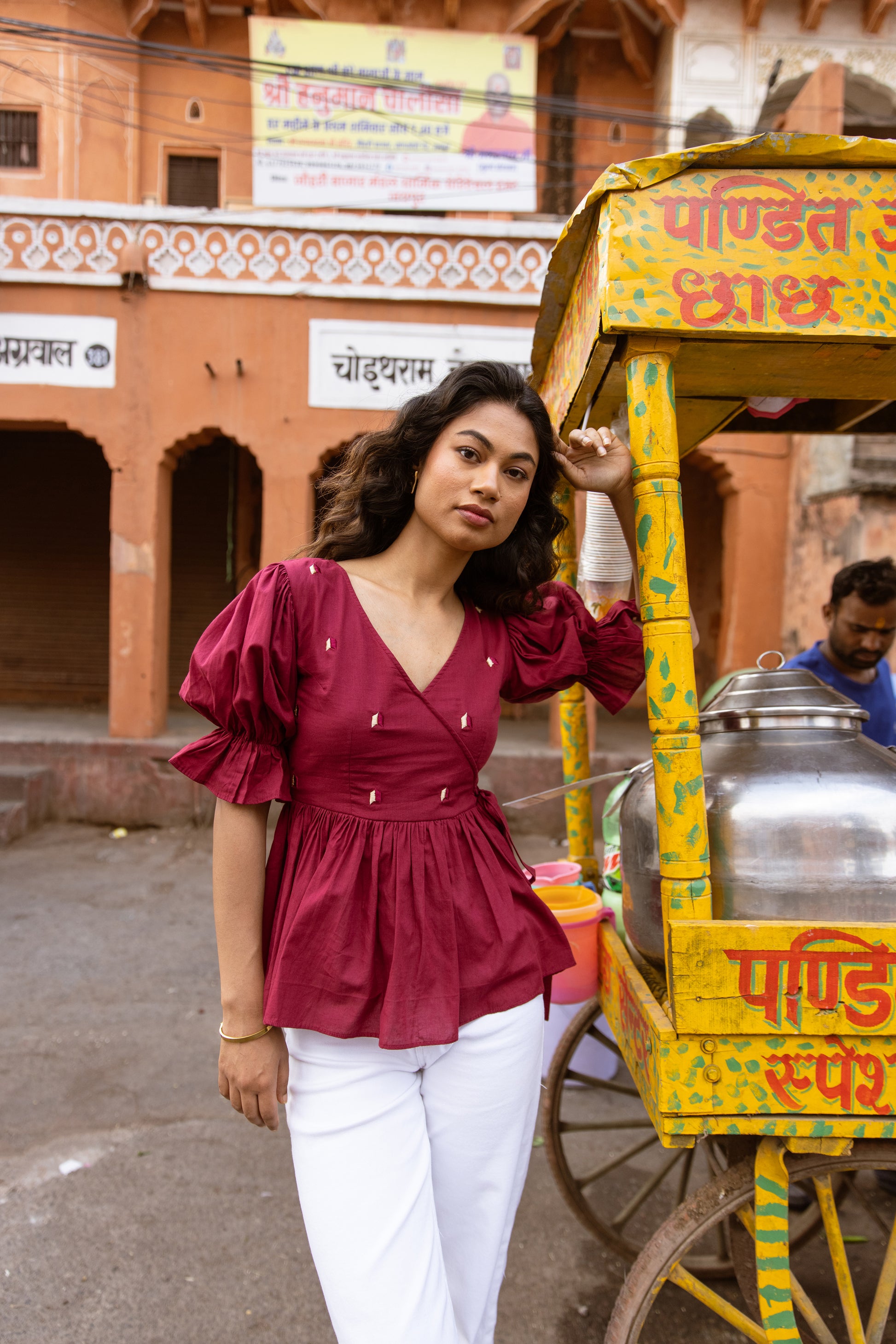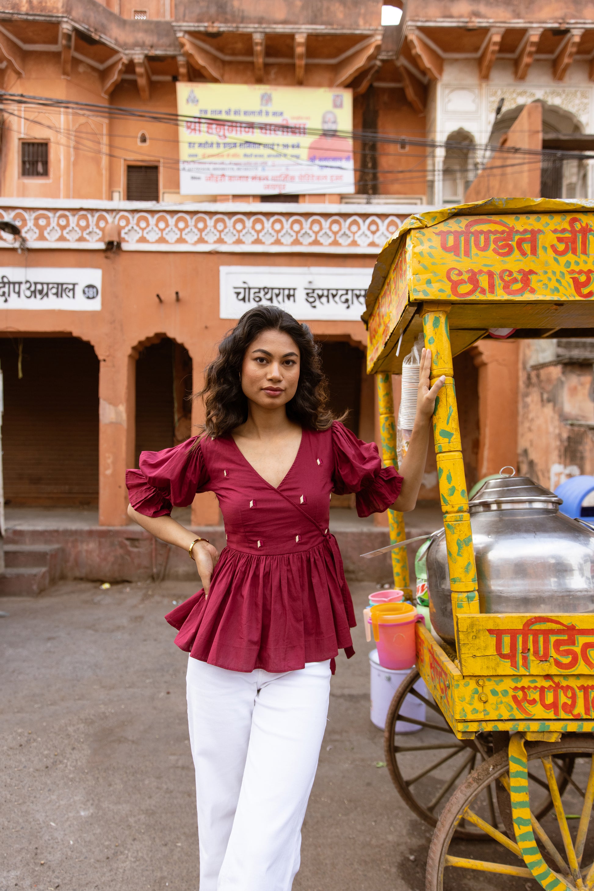 Brighten up your wardrobe with our Pop 'n' Wrap Top—a fresh spin on the beloved wrap dress, now in a versatile top silhouette. Cut from soft, breathable 100% cotton, it features the same intricate bust embroidery, a flattering V-neckline, and statement puff sleeves with ruffled cuffs. The adjustable wrap-front tie lets you customise the fit which makes it perfect for pairing with high-waisted skirts, jeans, or trousers.