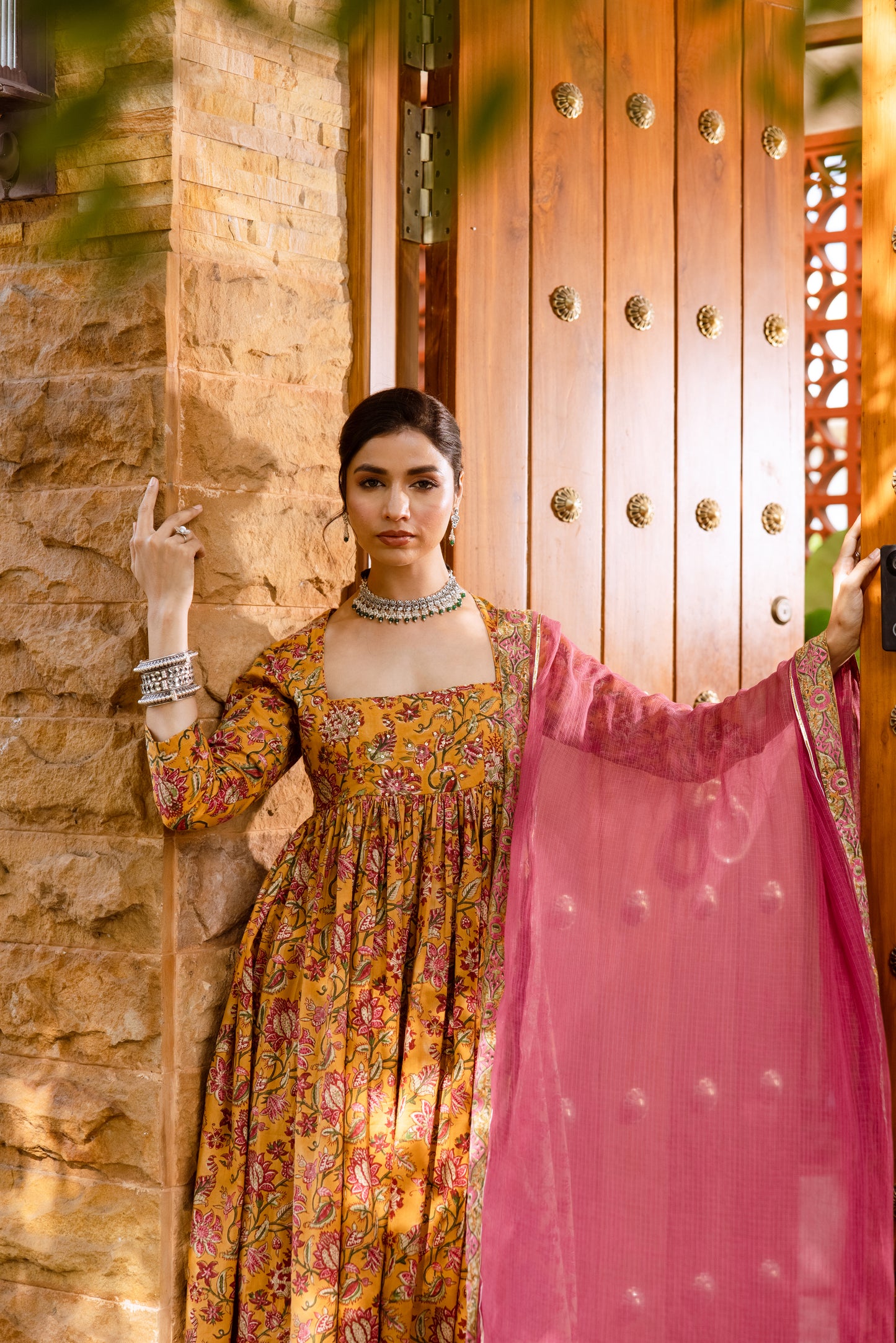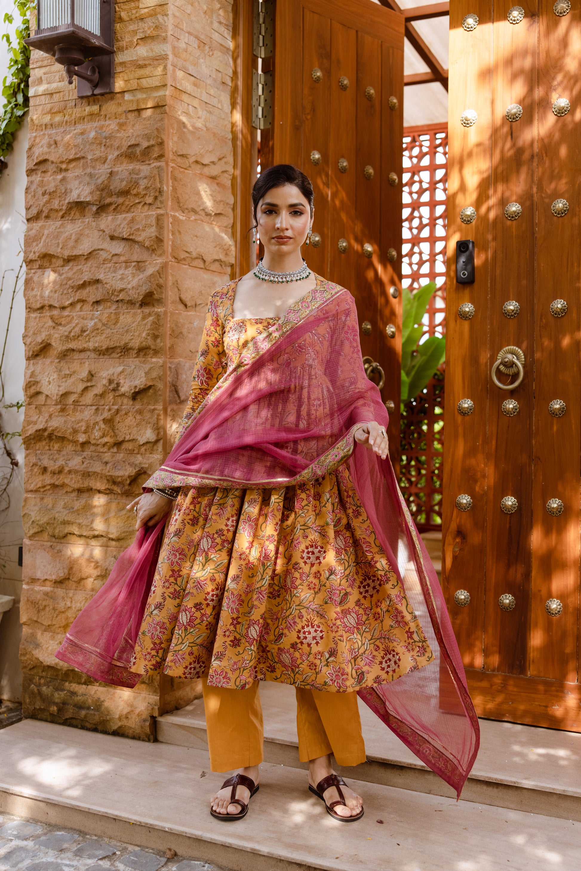Step into effortless elegance with our 3-piece Nyra cut suit designed for festive charm. Crafted from breathable, high-quality fabric, the suit features traditional handblock prints enhanced with delicate handwork, adding a touch of artisanal sophistication. The ensemble includes a coordinating contrast shawl, completing the look with graceful drape and vibrant flair.