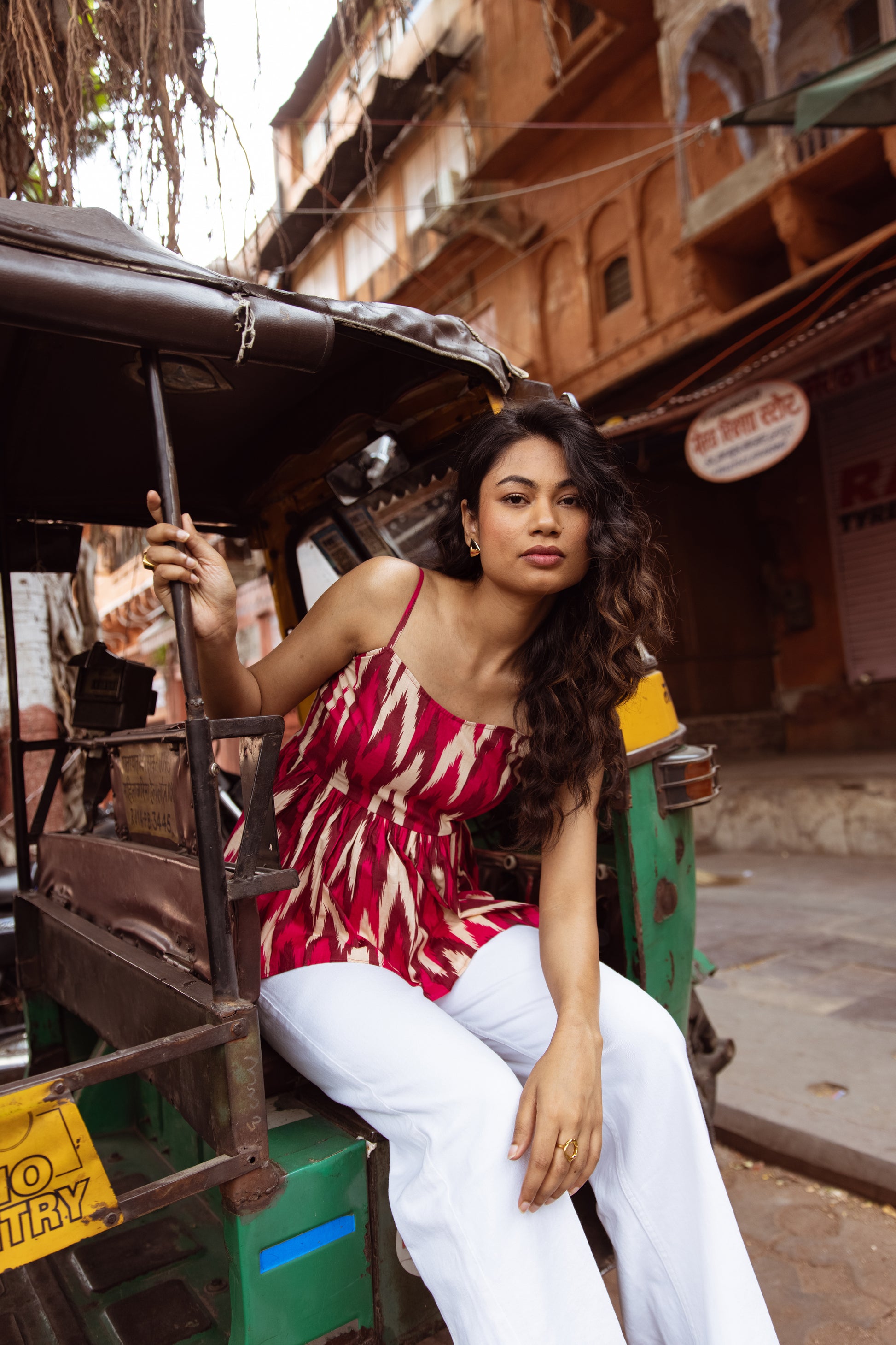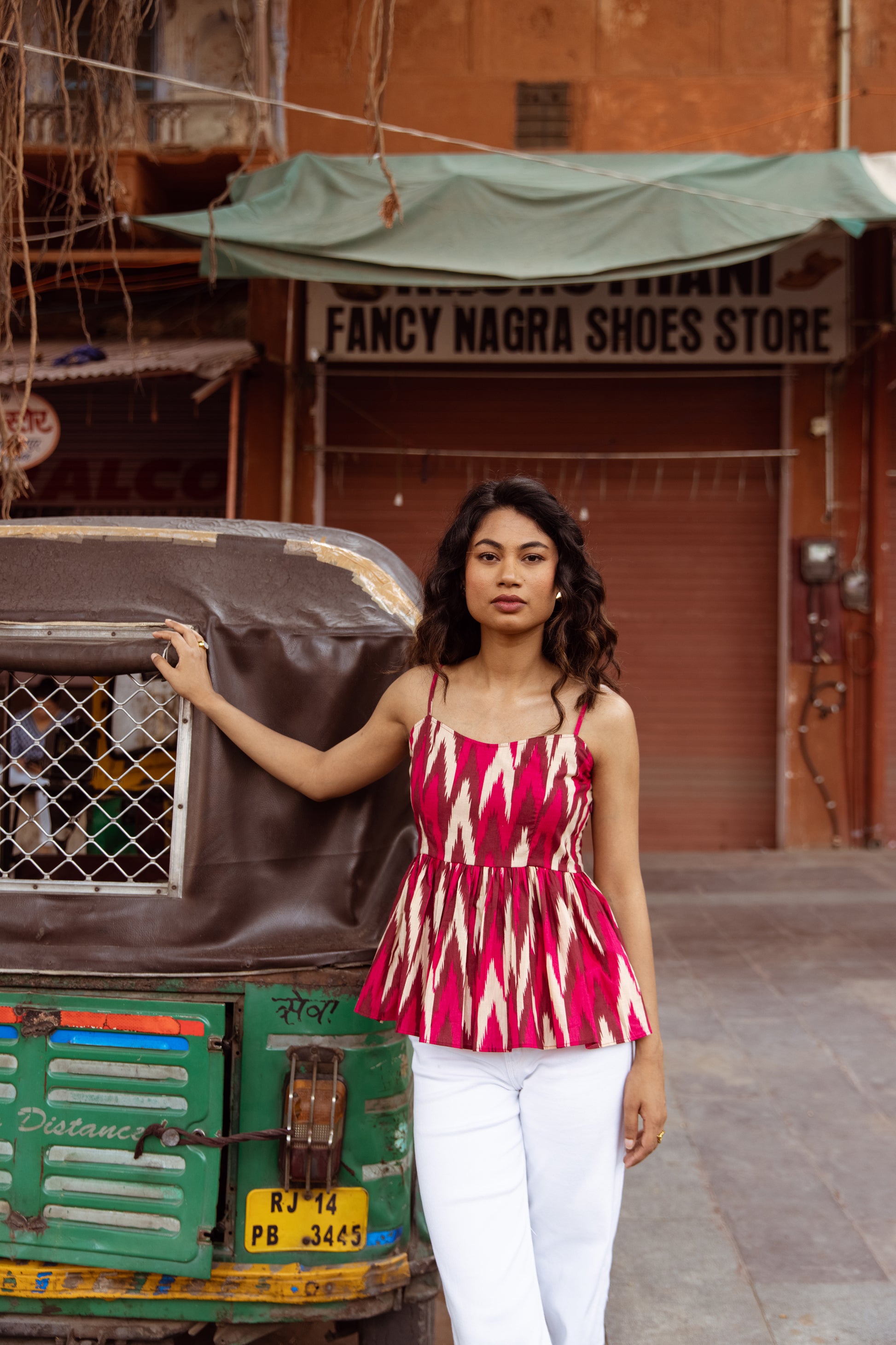 Say hello to your new favourite statement piece. The Jaipur Zig Top features a striking ikat-inspired print in rich pink and ivory—bold, bright, and made to turn heads. Printed on soft, breathable cotton, this top is as comfortable as it is eye-catching.