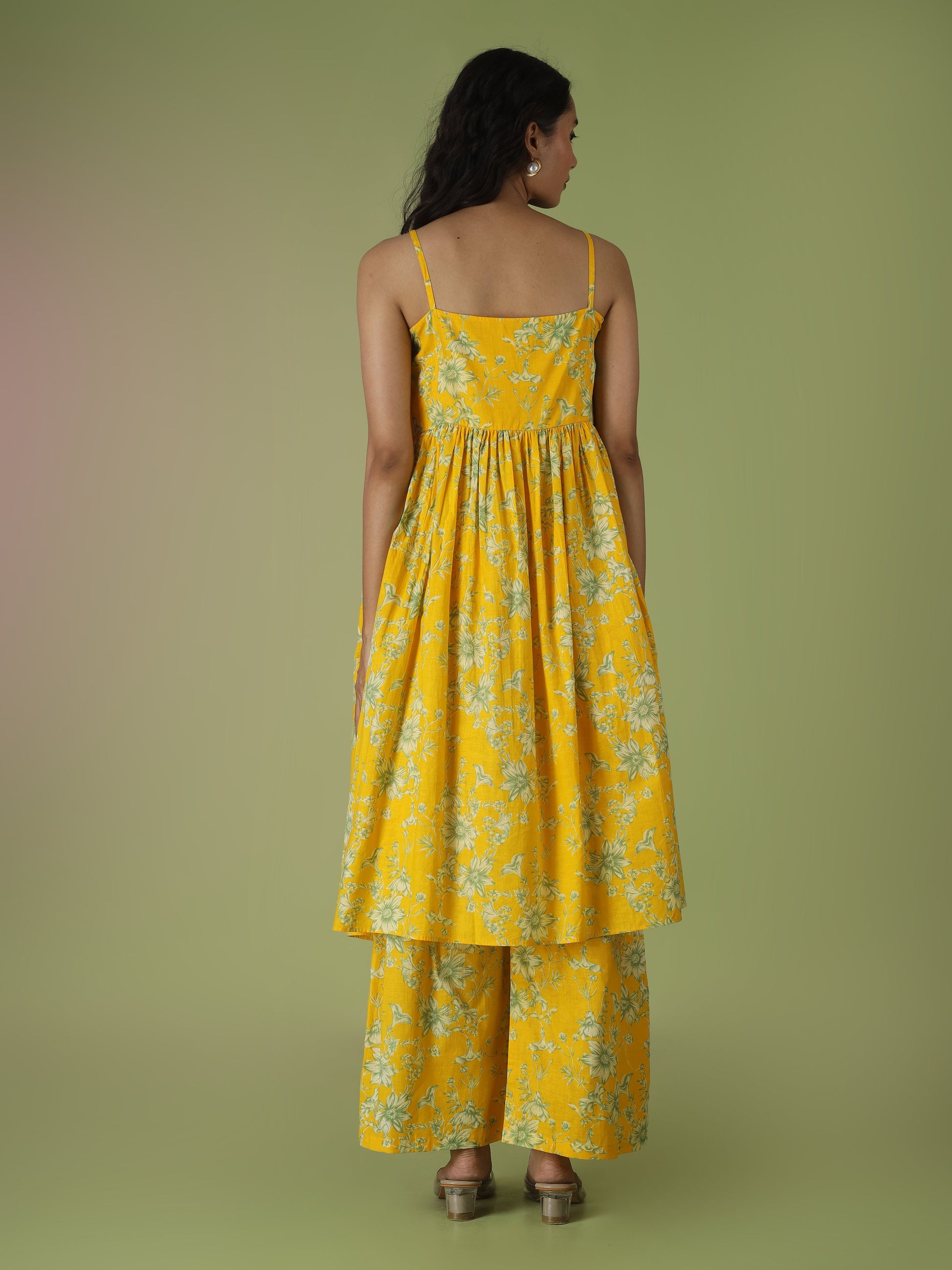 This set includes a strappy anarkali, palazzo pants, and dupatta. The cross-gathered neckline is adorned with moti detailing and hand embroidery, while thread-run gathers at the waist add flow. The dual-shade dupatta features lace-edged borders and tassels, paired with back-elasticated palazzos for a comfortable fit.